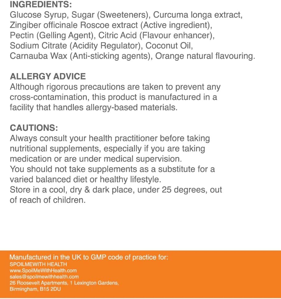 Natural Joint & Digestive Support – Made Delicious: SpoilMeWith Health’s Turmeric & Ginger Gummies provide a tasty and convenient way to support your body daily. Each natural orange-flavoured gummy delivers a powerful blend of turmeric extract, ginger extract, and black pepper for enhanced absorption and effectiveness.