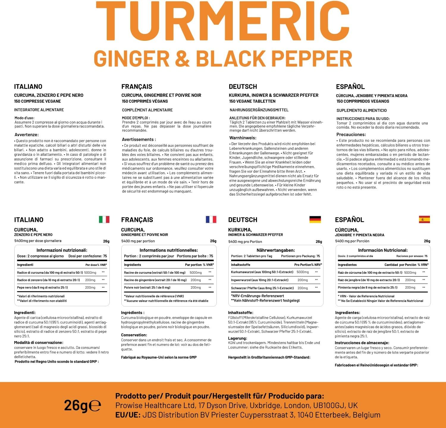 Turmeric Tablets 5400mg with Black Pepper, Ginger – High Strength Turmeric 95% Curcumin Supplements | 150 Easy Swallow Tablets (Not Capsules or Powder) – Letterbox Friendly – Made in UK – Prowise