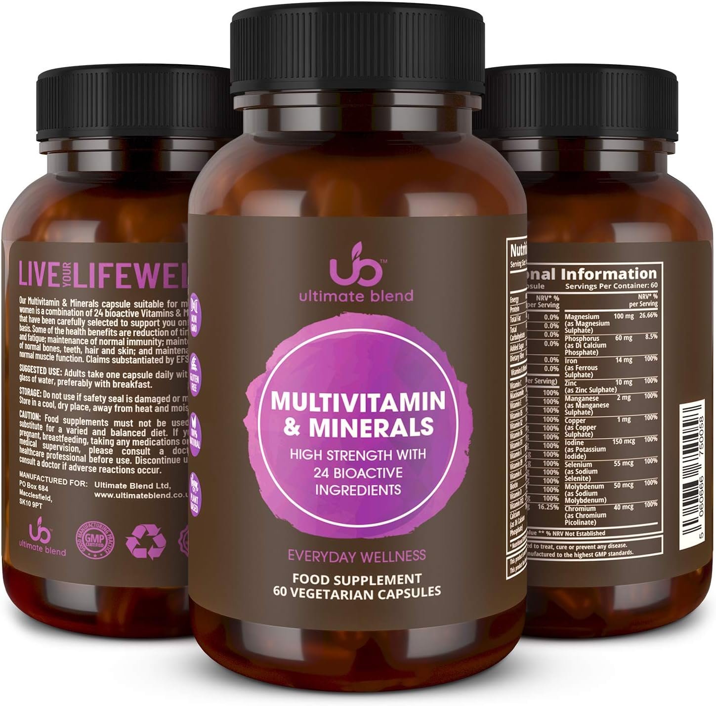 ENJOY EVERYDAY WELLNESS with Multivitamin & Minerals Capsules by Ultimate Blend. Featuring 24 bioactive ingredients that have been carefully selected to support you on a daily basis. Suitable for men and women.
