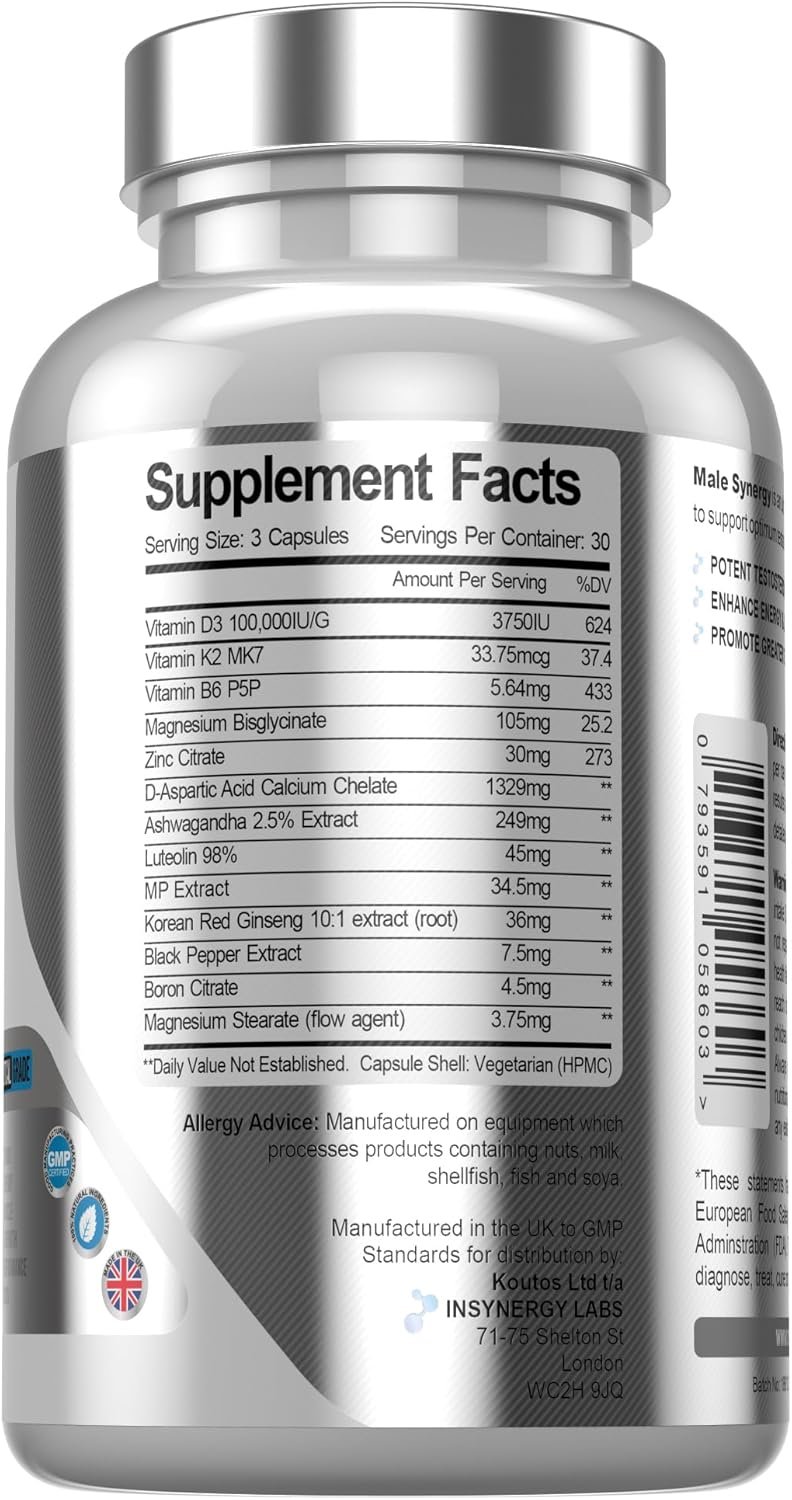 Supplement bottle labeled 'Male Synergy' with product details. Ultra Premium Testosterone Booster, 90 capsules, made in Britain by Invynergy Labs.Supplement bottle labeled 'Male Synergy' with product details. Ultra Premium Testosterone Booster, 90 capsules, made in Britain by Invynergy Labs.