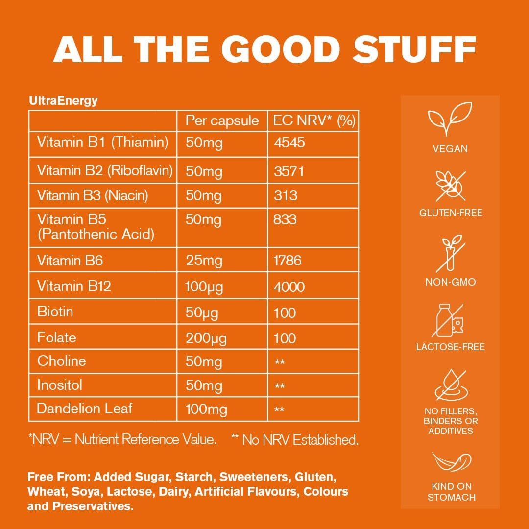 SUSTAINED ENERGY: UltraEnergy is a high-strength daily B Vitamin Complex to sustain your mind and body’s energy through the day. Formulated by expert nutritionists, it supports your energy, heart and psychological function, helping protect against fatigue, irritability and lack of focus.