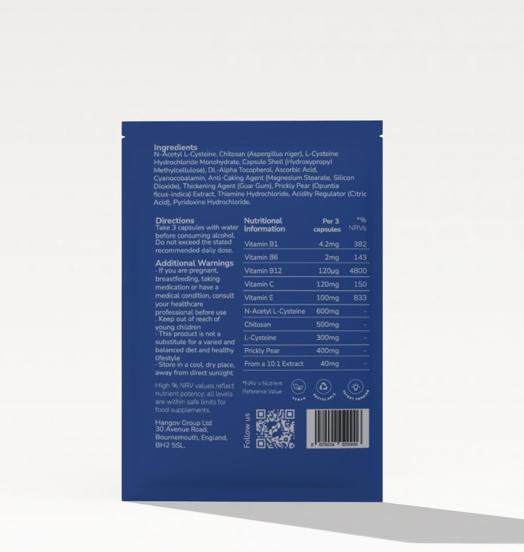 Hangov was created for people who want to enjoy life fully without compromising their wellbeing. Designed at the intersection of modern biotech and everyday lifestyle, it is a pre drink supplement that supports balance, clarity and next-day vitality, helping you socialise with confidence and wake up feeling more energised. The formulation draws on detailed nutritional science and clinically relevant ingredient dosing, combining N-Acetyl L-Cysteine and L-Cysteine to support normal cellular protection and oxidative balance. Vegan Chitosan derived from Aspergillus niger contributes to wellbeing through advanced molecular binding science, while a high-strength 10:1 Prickly Pear Extract provides concentrated plant antioxidants to help protect cells from oxidative stress. Vitamins C and E add further antioxidant support, and a complete B Vitamin Complex contributes to normal energy metabolism and the reduction of tiredness and fatigue. Each serving comes in a travel friendly sachet that slips easily into a pocket or bag, making Hangov simple to take wherever the night leads you. Just open a sachet and take the three-capsule serving before social drinking or the following morning as part of your wellness routine. Hangov is vegan, non gmo and made to high quality standards in the uk, offering a clean, modern and convenient way to support your lifestyle without compromise.