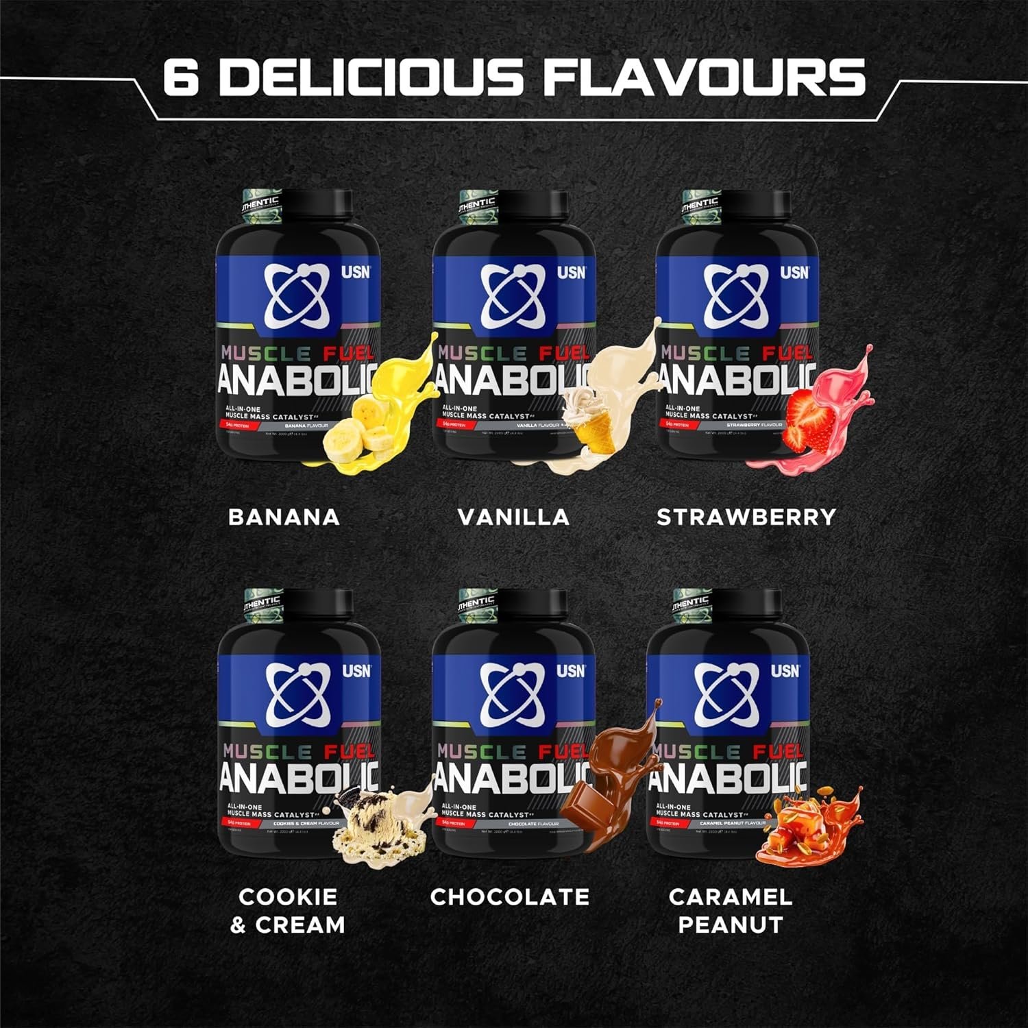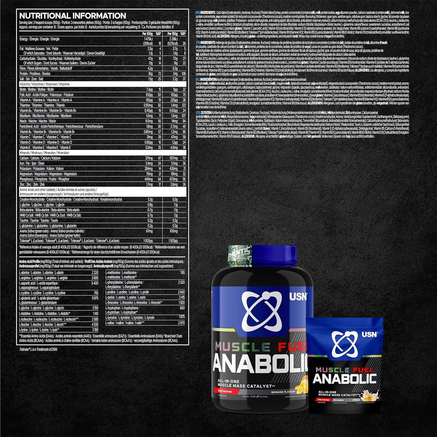 USN Muscle Fuel Anabolic All-In-One Muscle Mass Gainer, Banana Flavour – 2kg, 54g Protein Powder, 5g Creatine Powder & 5g BCAA Powder For Maximum Muscle Growth, Post Workout Recovery Drink Mix