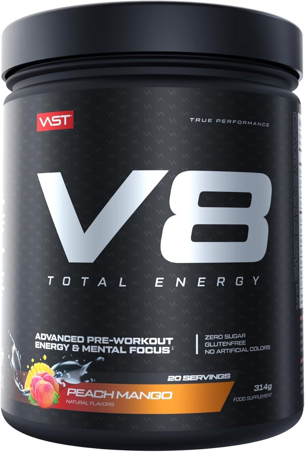 V8 Total Energy – Pre Workout Booster – Training Booster – CarnoSyn® BetaPower® Natural Caffeine – Vegan – Sugar Free – 20 Servings – Made in Germany – Peach Mango