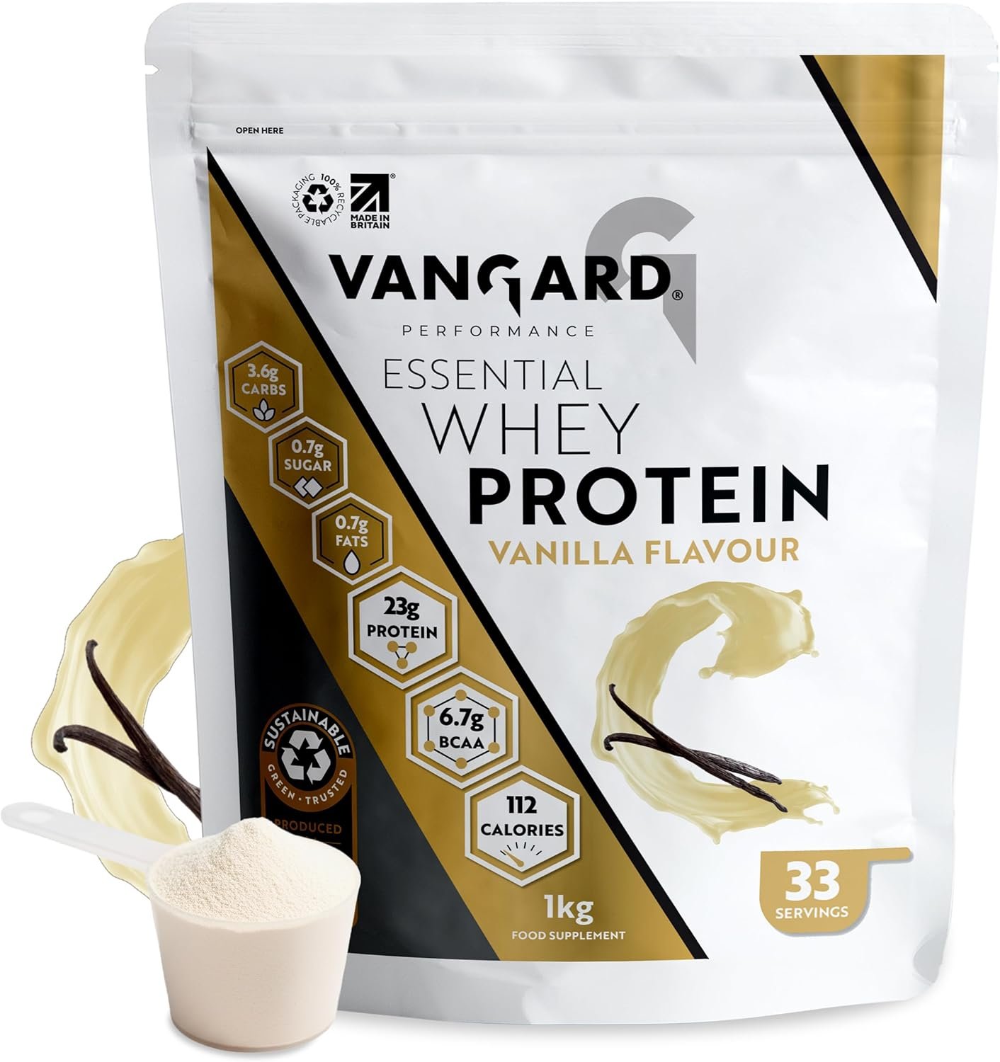 Vangard Essential Whey Protein Powder Vanilla Flavour (1kg – 32 Servings), Soluble Halal Protein Shake, 23g of Protein Per Serving