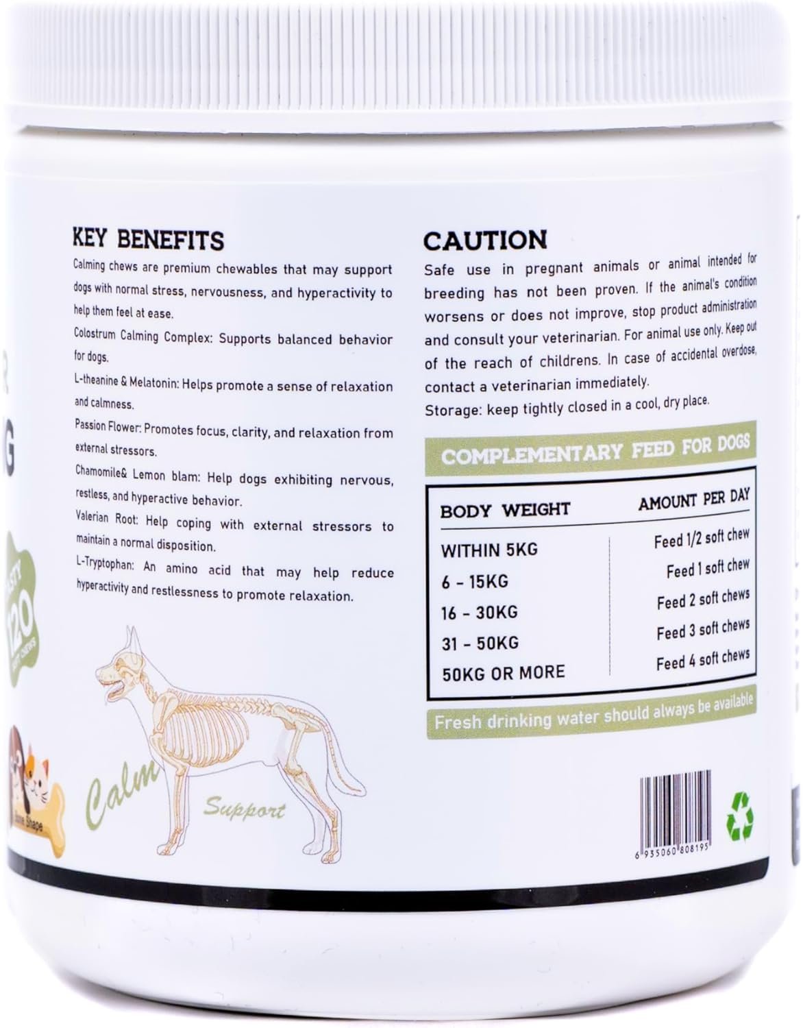 Soothes & Relaxes Designed to support dogs during moments of stress, our advanced formula stimulates brain alpha waves, helping to induce a sense of comfort and relaxation. Whether it’s thunderstorms, separation, travel, vet visits, or crowded events, these calming chews offer the perfect solution to keep your pup at ease.