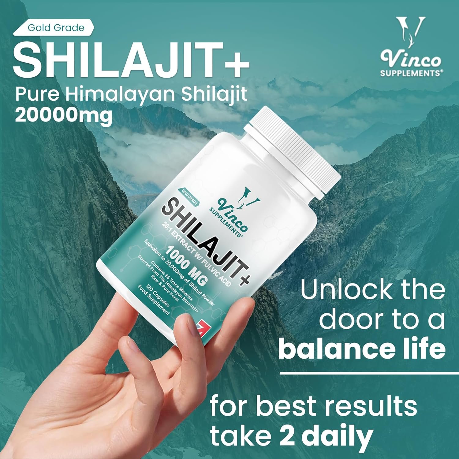 Vinco Himalayan Shilajit 120 Capsules 20,000mg, Robust 1000mg Per Serving, Rich in 85+ Minerals & Fulvic Acid, Convenient Alternative to Resin for Men & Women