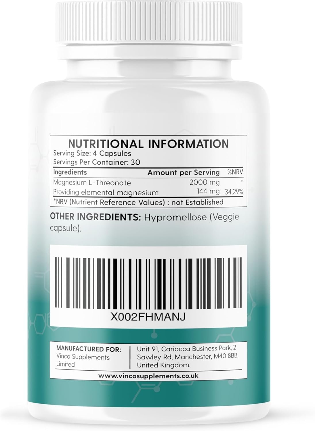 Vinco Magnesium L-Threonate Supplement – 120 High Strength Magnesium L Threonate Capsules – 2000mg Bioavailable Form of Magnesium per Serving – Non-GMO & Gluten Free – Made in The UK