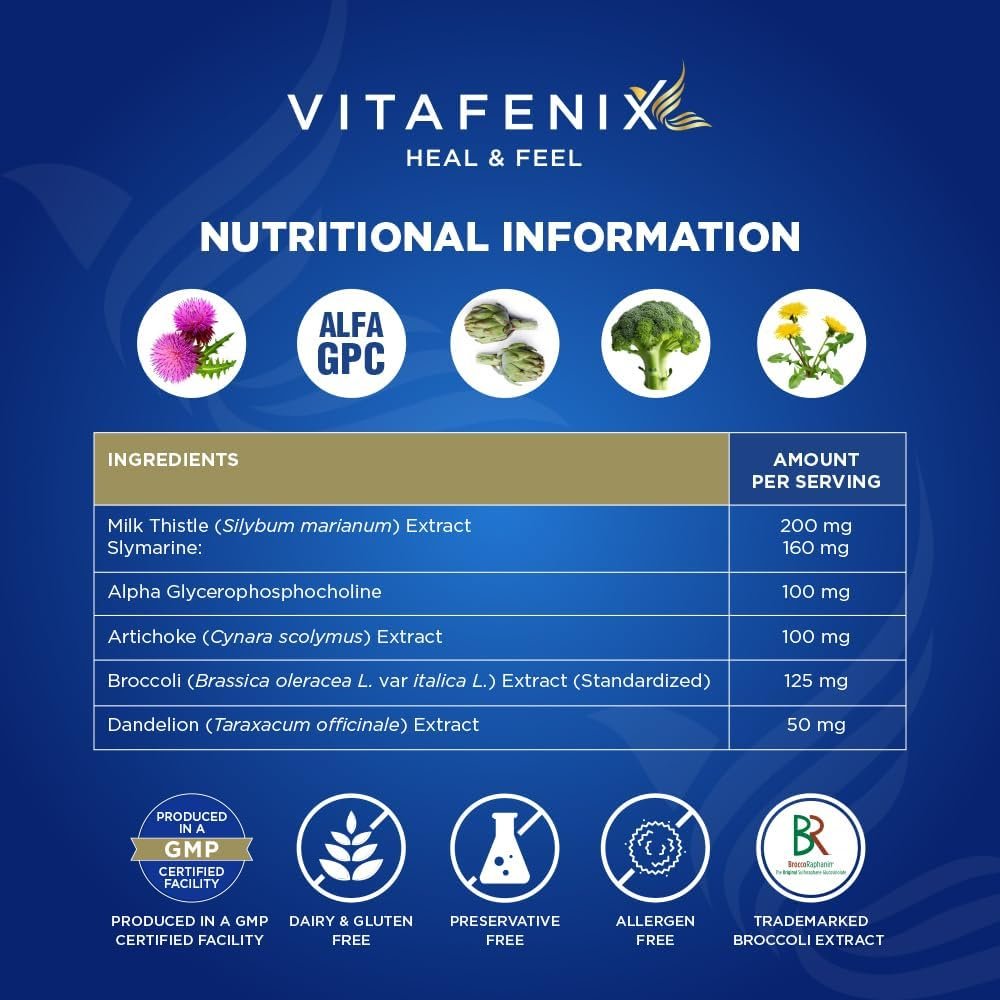 Vitafenix Liver Support & Detox Supplement Capsules – High Strength Sulforaphane from Broccoli Sprout Extract, Milk Thistle, Dandelion, Artichoke and Alpha GPC – 60 Vegan Capsules