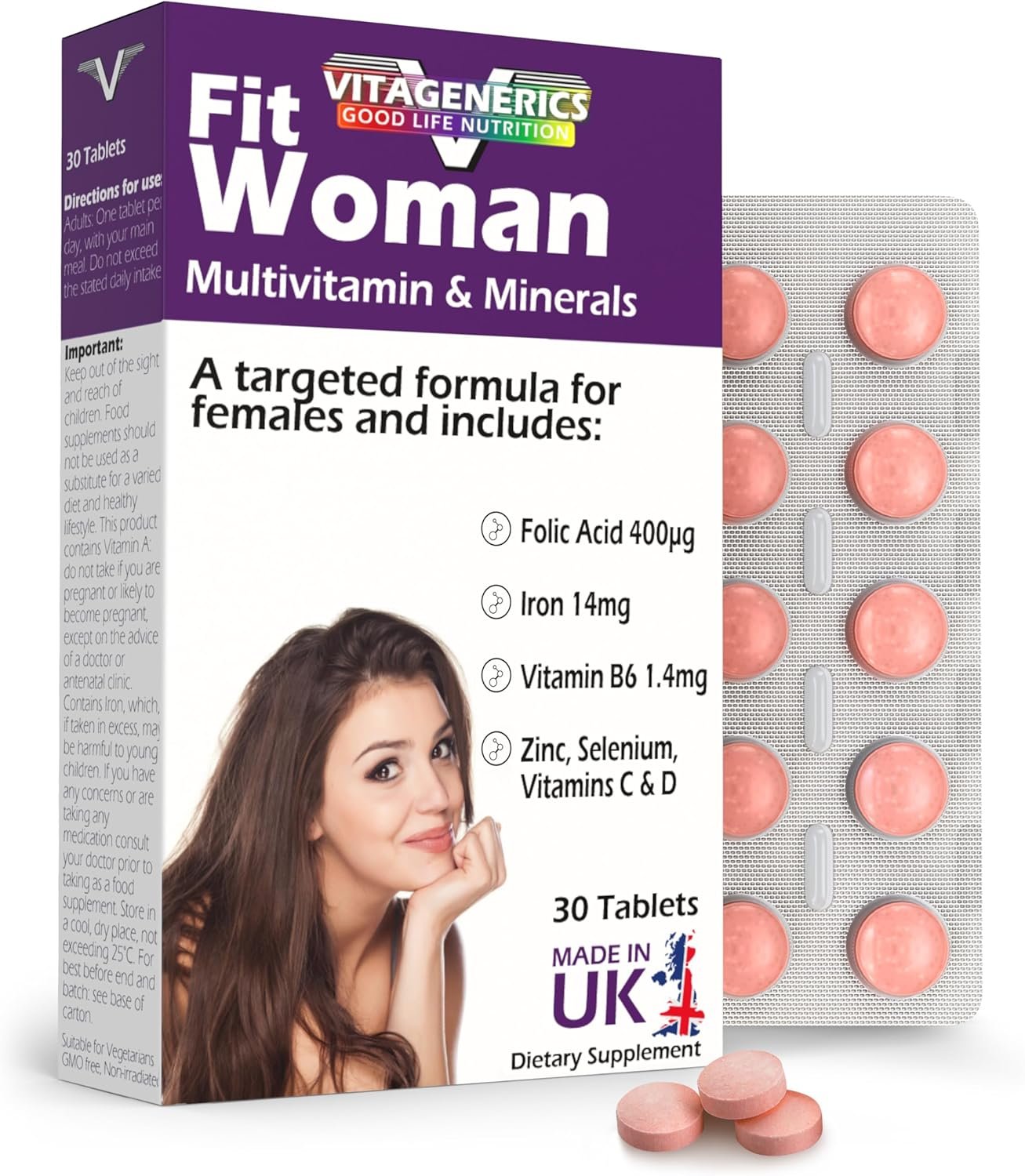 VITAGENERICS FitWoman High Strength Multivitamin & Minerals | x30 Tablets | with Folic Acid, Iron, Zinc, Selenium, Biotin, Vitamin C, B-Complex & More! UK Made Supplement for Women