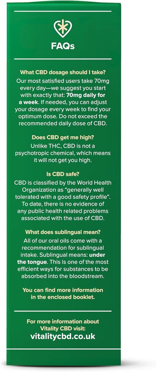 The Vitality CBD Oral Drops is a premium CBD oil, created using a high-quality CBD hemp extract. This CBD oil is 3rd party tested and comes with a guaranteed 0 Percent THC.These CBD drops have been blended with hemp seed oil to give you the full hemp experience and prioritise natural methods. With a clear and easy-to-use pipette in every bottle and three delicious CBD flavours (natural, lemon and berry) for you to try out, this is a great first CBD oil.To use these CBD drops, simply aim the pipette under your tongue, dose as required, and allow the CBD oil to soak into the blood vessels beneath the tongue for 90 seconds. That way, the CBD is processed by your body much more efficiently.Recommended dosage: 70mg CBD per day. Use approx. 1 full pipette (1ml) in the morning and just under 1 full pipette (0.7ml) in the evening.1ml pipette (20 drops) = 40mg CBD1.7ml = 68mg CBD. Do not exceed the recommended daily dosage.
