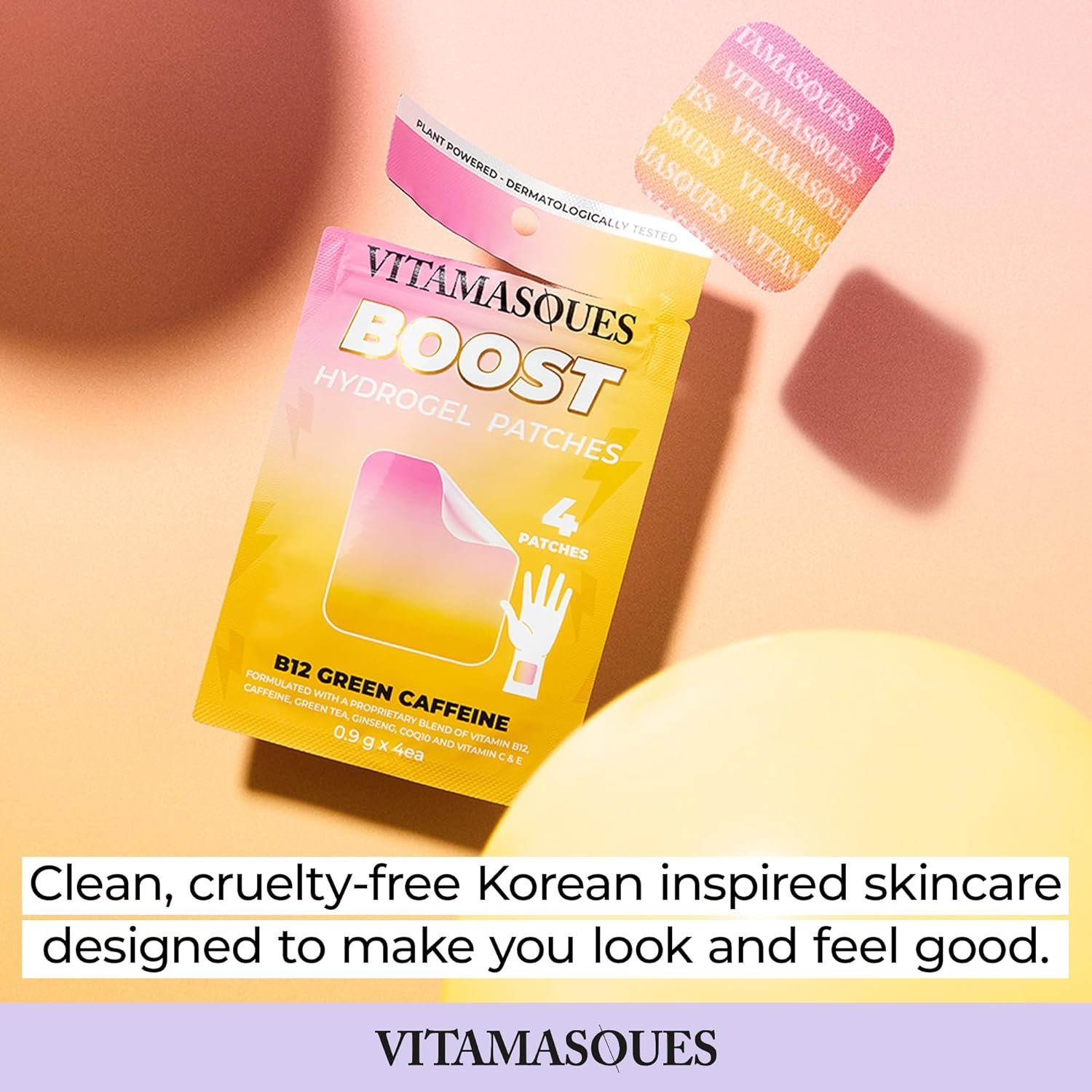 Wellness Hydrogels: Vitamasques Boost B12 Green Caffeine Hydrogel Patches are plant powered patches made with B12, Green Tea, Ginseng, and Caffeine. Includes 3 packs of 4 patches.