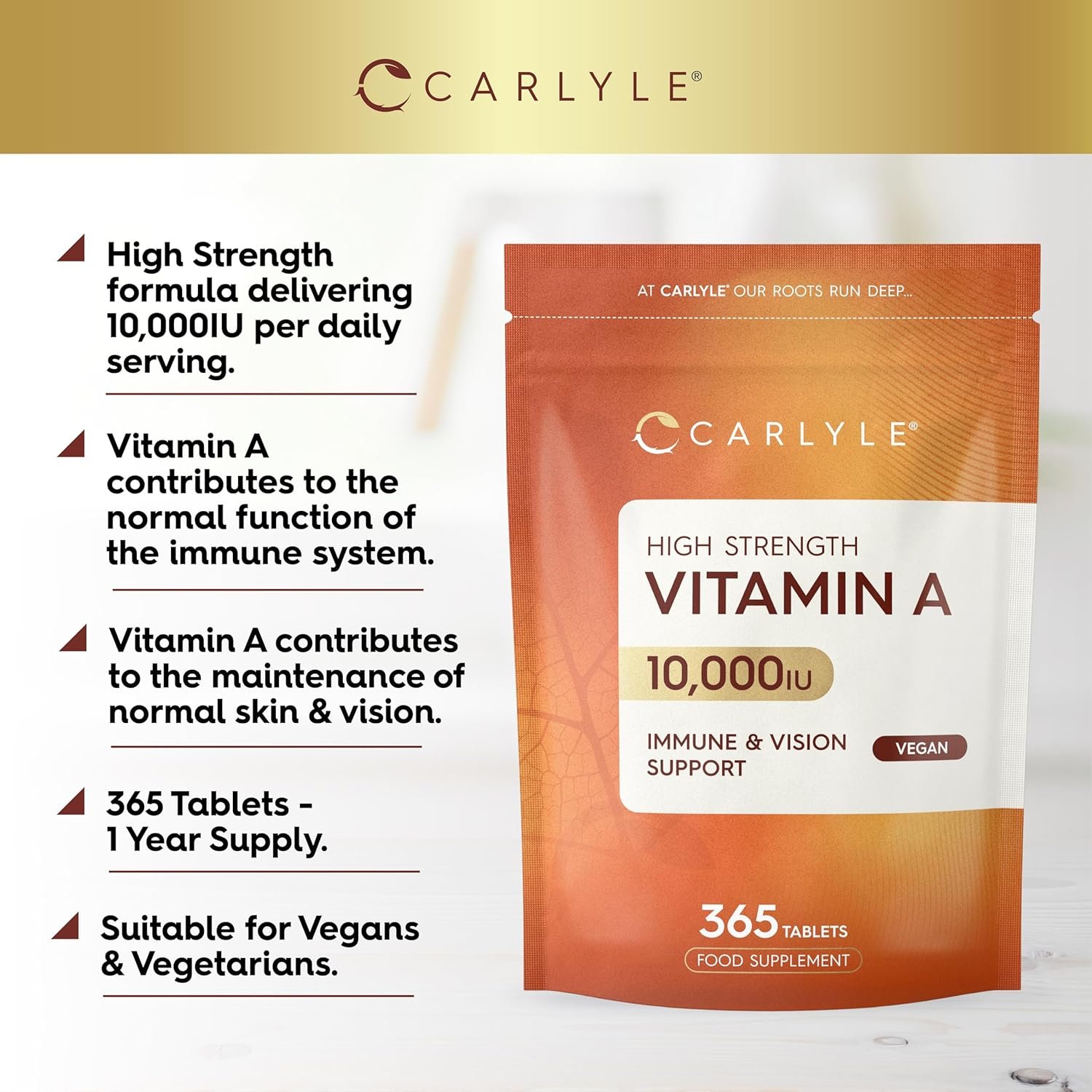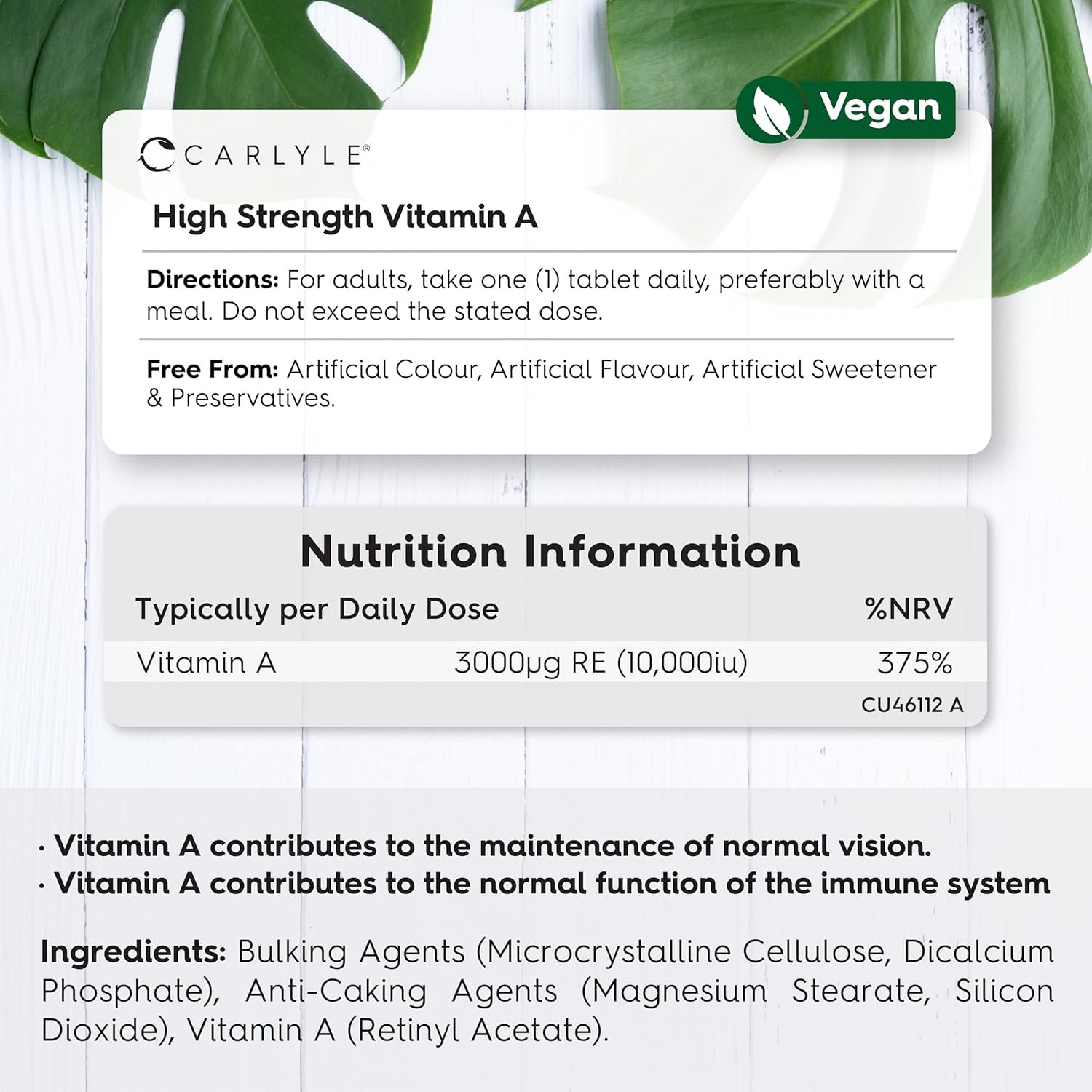 WHY CARLYLE VITAMIN A TABLETS?:Our high-strength formula delivers 3000µg (10,000 IU) of pure Vitamin A in a single tablet for effective daily support.