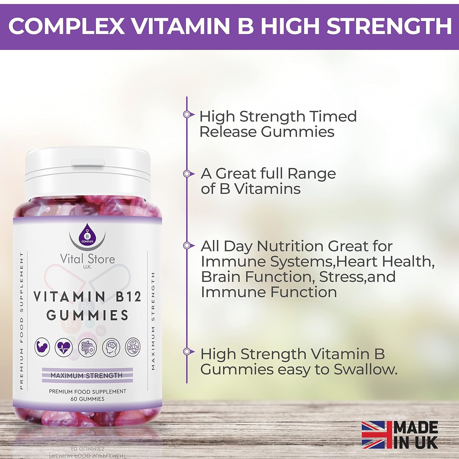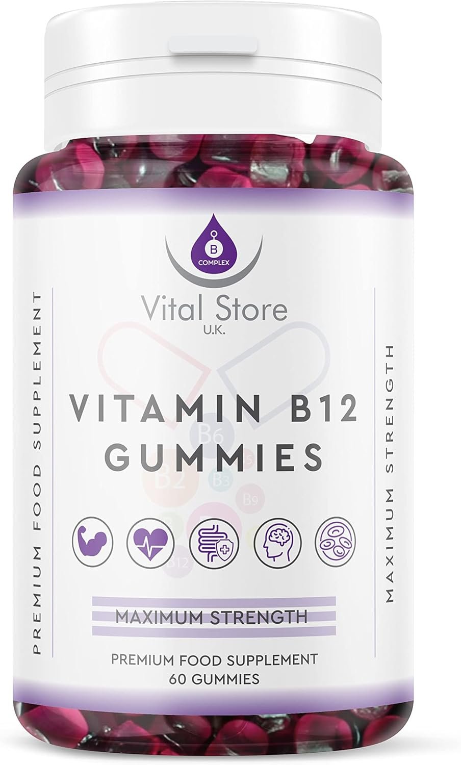 A Great Source of High Strength Vitamin B12 Cobalamin Complex Vitamin B12, 9, 7, 6, 5, 3, 2, 1, Vitamin D2 & Vitamin C These premium vitamin B-Complex gummies are rich in essential vitamins, the key nutrients required for a healthy lifestyle and balanced diet. 100 Percent Ethical & Sustainable to help make a positive difference to your health and the world together. Incredible and effective Our Vitamin B Complex food supplement is ethically sourced with gluten-free, NON-GMO, and dairy-free Vegan ingredients. Sourced from ethical & sustainable sources and packaged with low environmental impact, this sustainable and low carbon impact product is great for people looking to help reduce CO2 emissions. Great Value Ethical B Complex High Strength Gummies We offer a great value subscription package helping us pass the savings on to you, our end users. If you’re looking for a great source of ethical B-Complex look no further. A great source of complex vitamins; key building blocks for muscle repair and growth. These high strength gummies are a perfect addition to any workout/dietary plan. Great Source of Vitamin B C & D These are ideal health supplements for women and men to help support your healthy lifestyle. You will receive 60 Gummies of high strength B Complex per bottle.