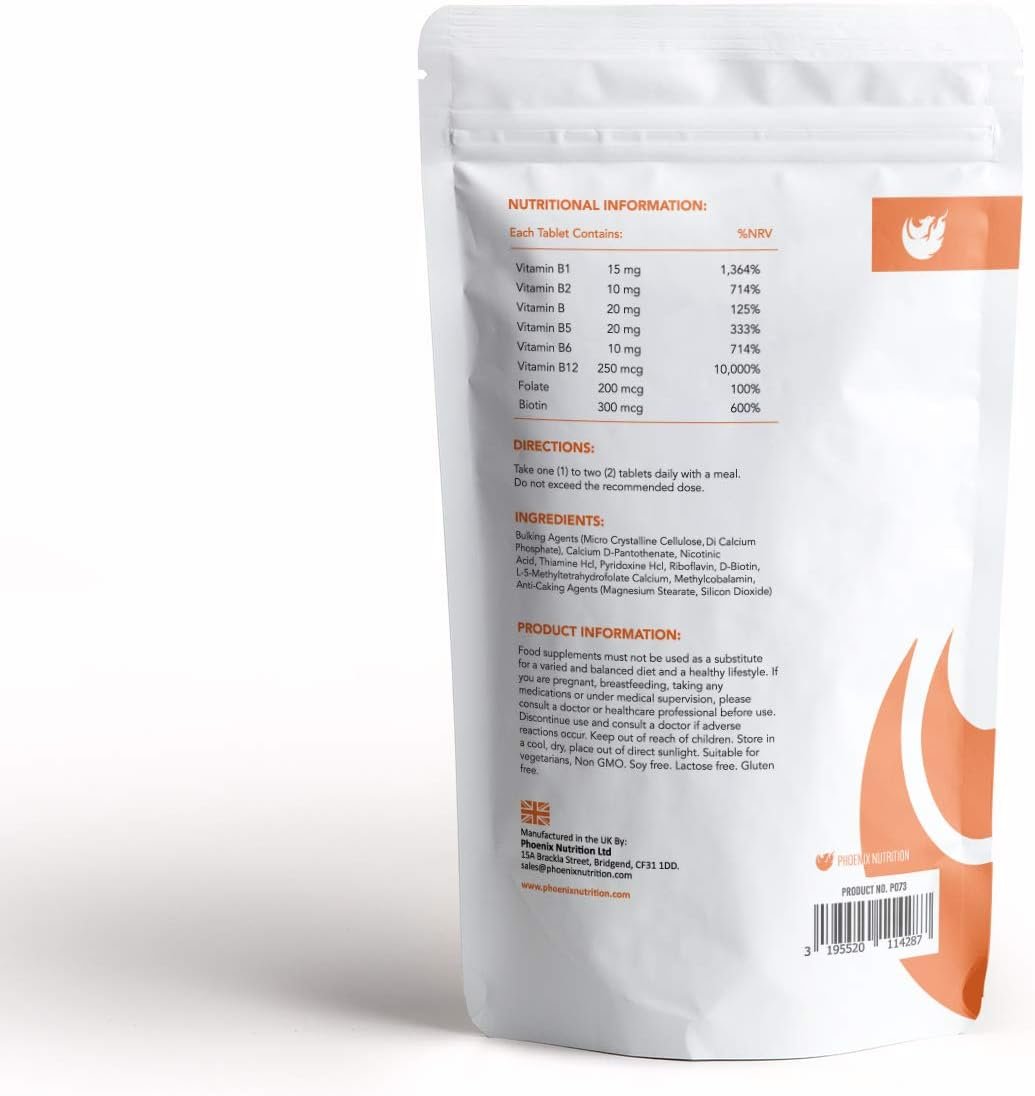 Each Tablet Contains: Vitamin B1 15mg 1,364%, Vitamin B2 10mg 714%, Vitamin B3 20mg 125%, Vitamin B5 20mg 333%, Vitamin B6 10mg 714%, Vitamin B12 250mcg 10,000%, L-5-HTHF 200mcg 100%, Biotin 300mcg 600%.