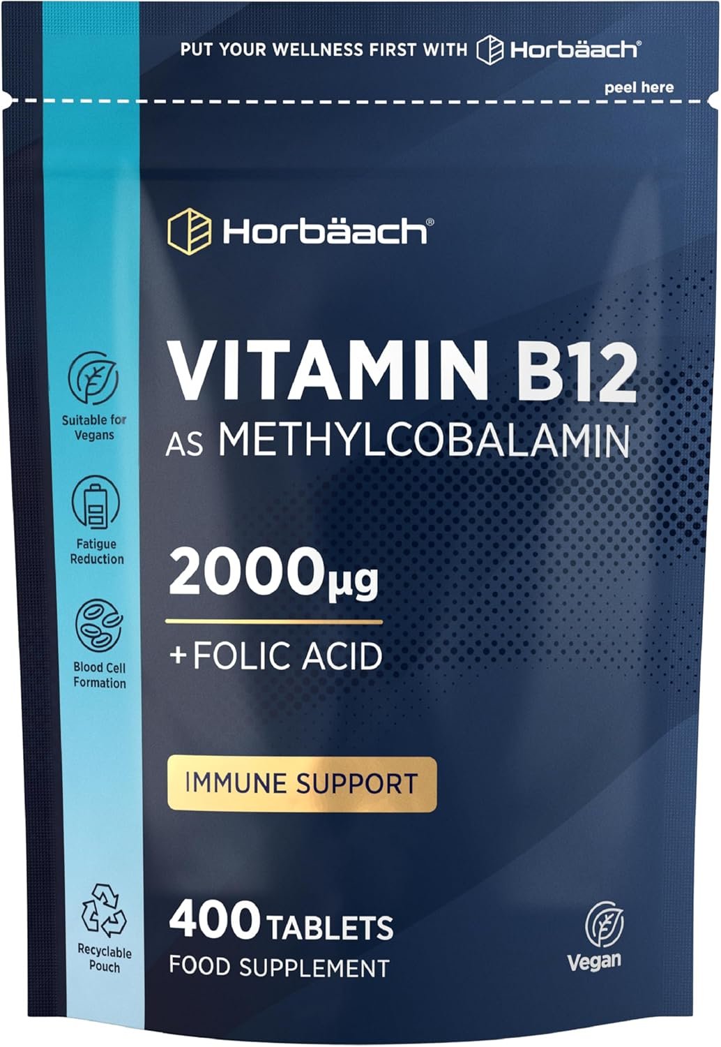 Vitamin B12 Tablets High Strength 2000mcg with Folic Acid | 400 Count | Vitamin B12 as Methylcobalamin | Vegan Supplement | by Horbaach