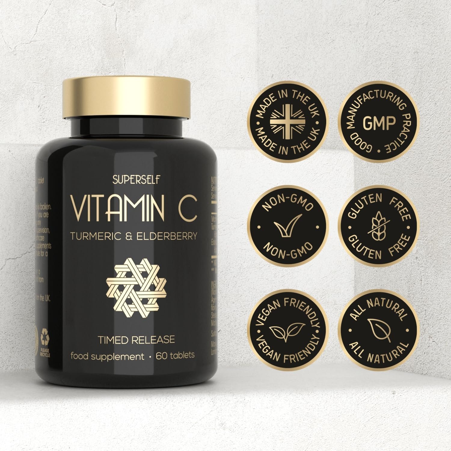 POTENT VITAMIN C TABLETS – Enriched with turmeric and elderberry fruit extracts, SuperSelf vitamin C 1000mg tablets have been created to offer a reliable, effective dietary supplement. Thanks to a timed-release formulation, you only need to take one tablet a day. Each package contains 60 tablets (a 2-month supply).