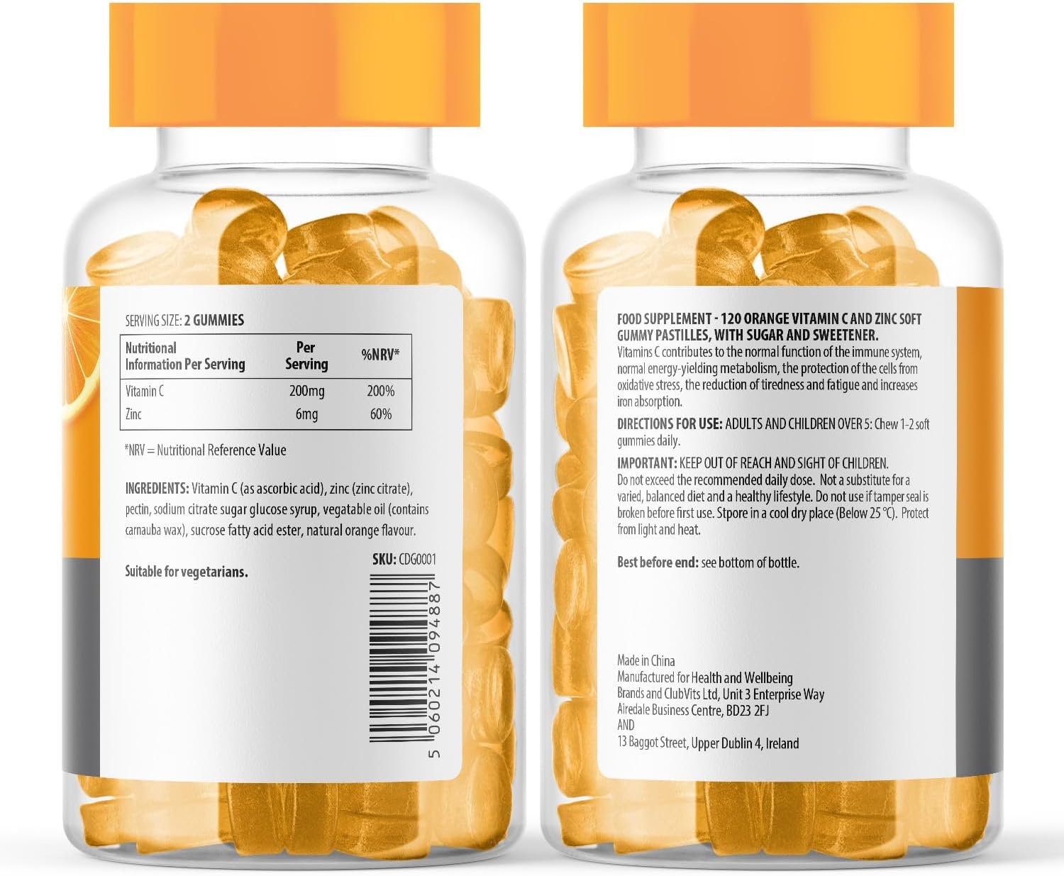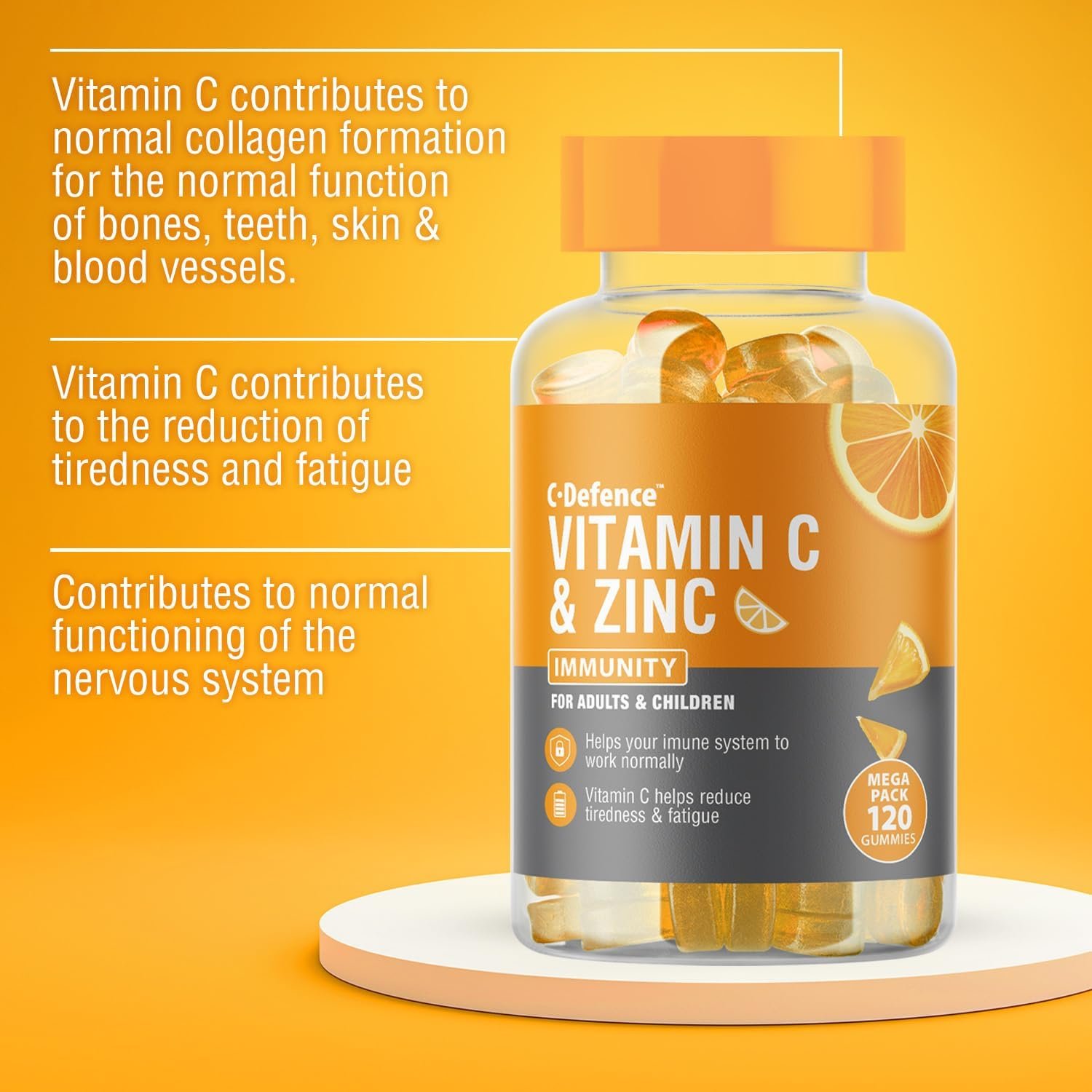 🍊HIGH-STRENGTH VITAMIN C & ZINC for Adults and Children. You get 200mg of Vitamin C & 6mg of Zinc per serving. Each bottle contains 120 chewable Vitamin C gummies, a supply of 2 months