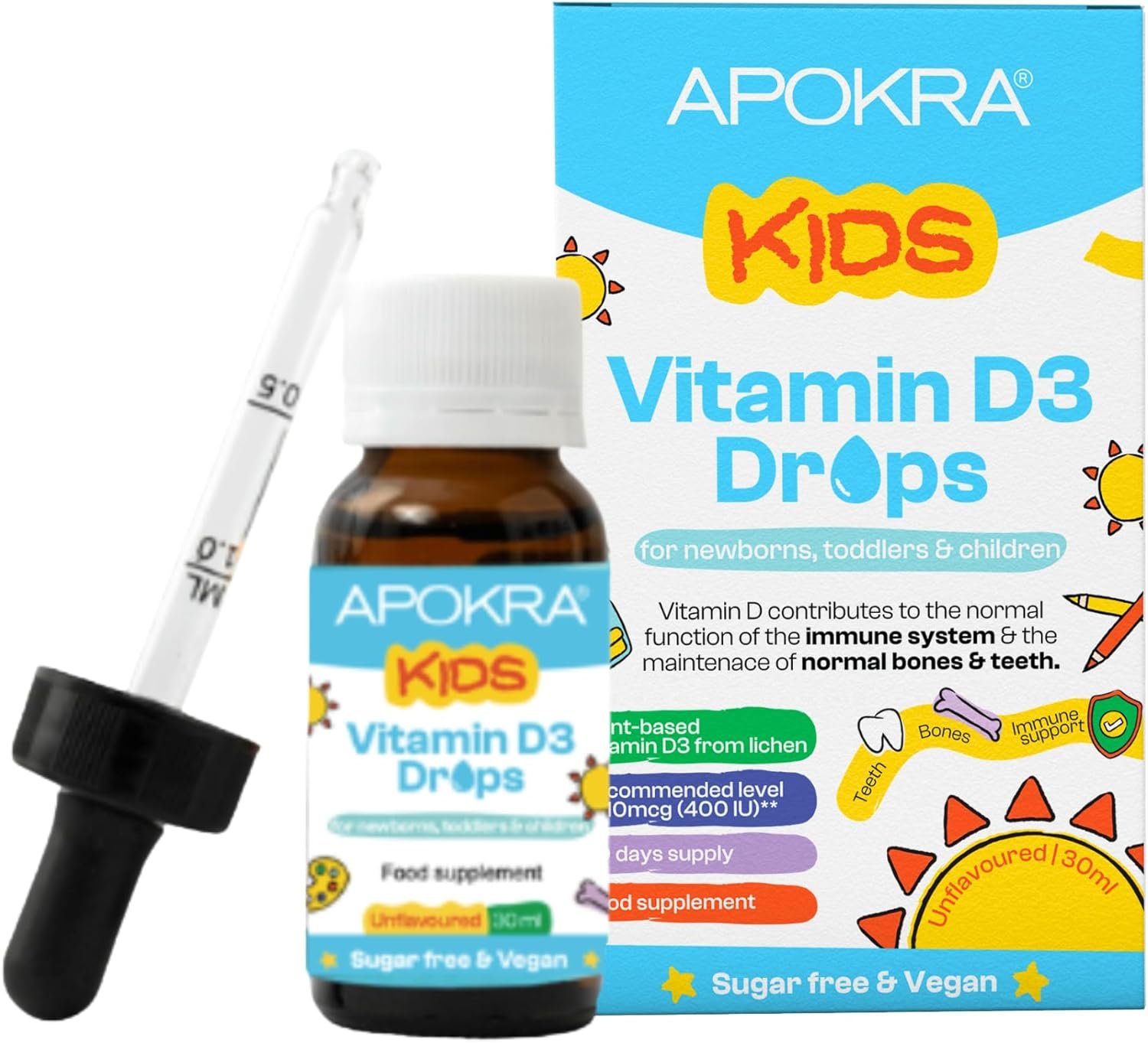 Formulated to contain 10 micrograms per 0.5ml of vitamin D. All APOKRA Kids products are sugar free, vegan, preservative free, gluten free, lactose free, fish free, peanut free, yeast free, without artificial colours & excluding artificial flavours.