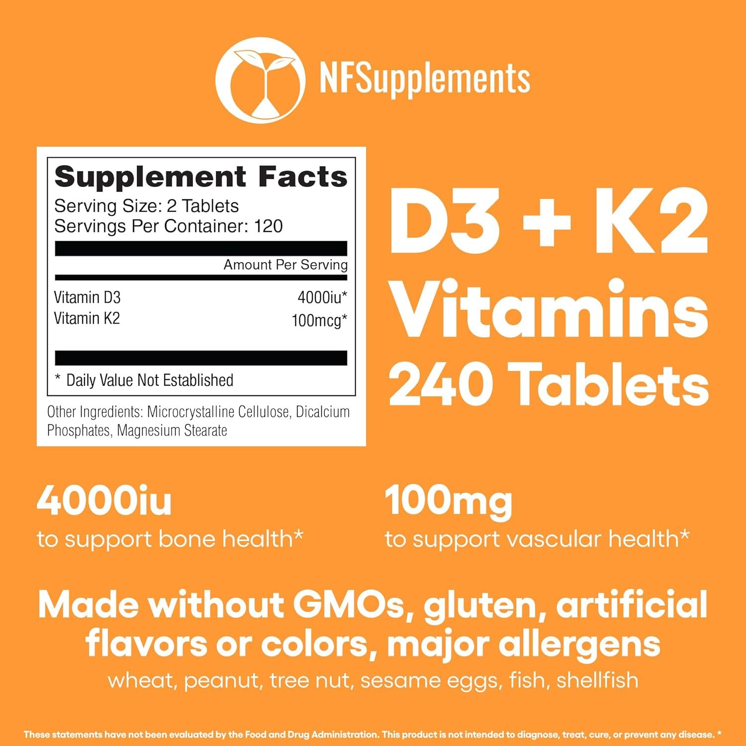 Vitamin D3 4000IU + K2 100mcg MK7 240 Vegetarian Tablets D3 K2 Supplement Non-GMO Made in The UK (240, Vitamin D3 + K2)