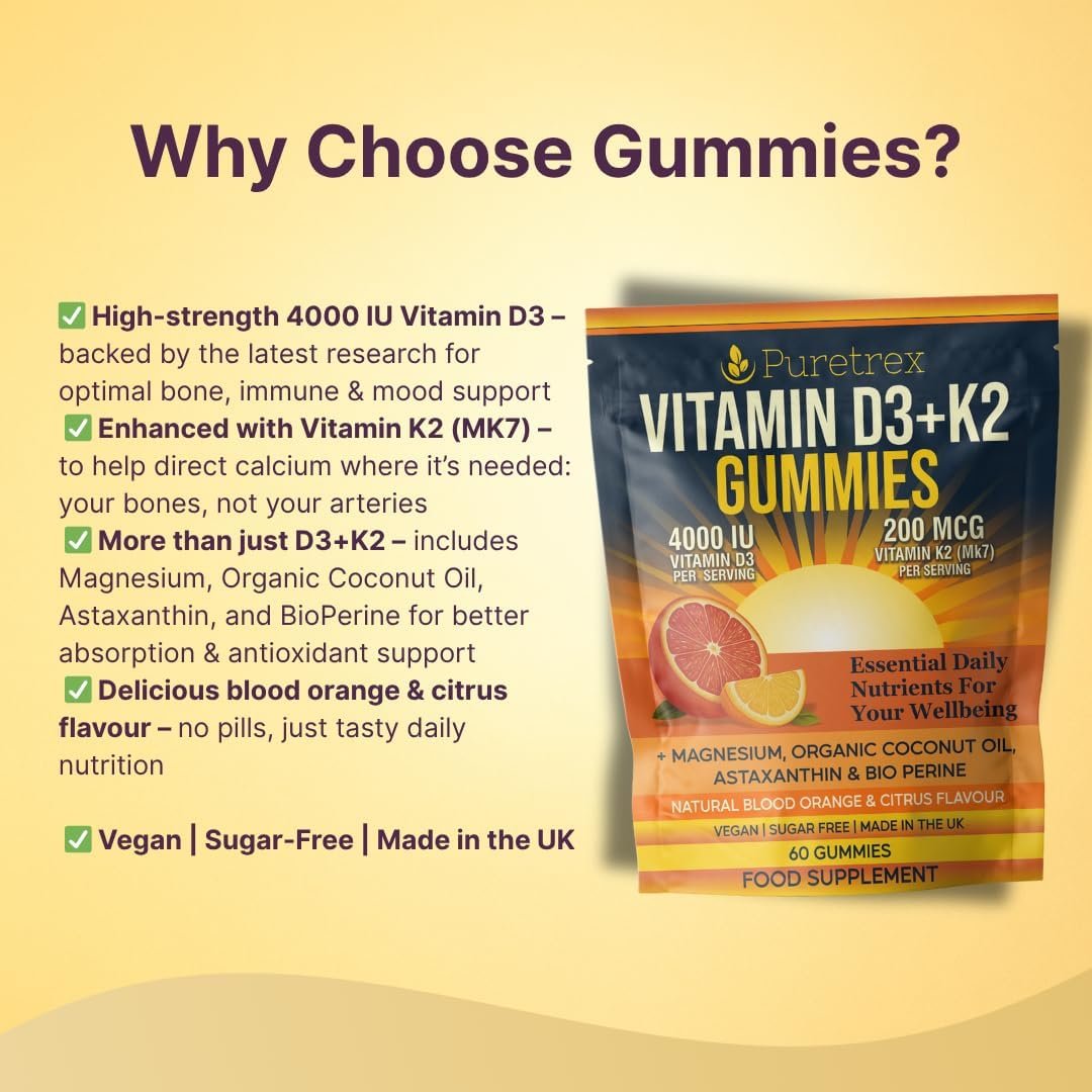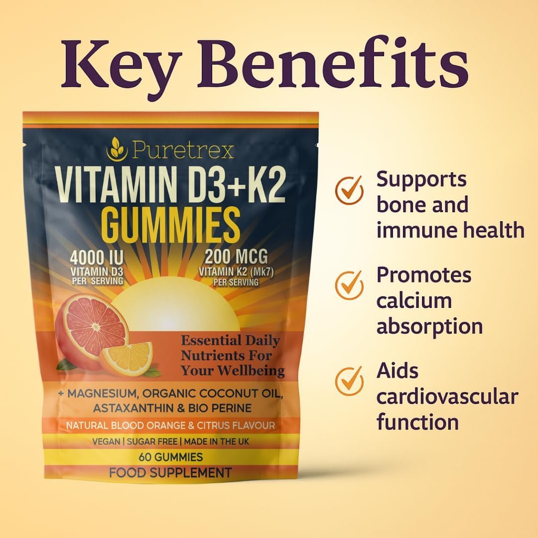 Say hello to your new daily wellness ritual 🌞 — PURETREX Vitamin D3 + K2 Gummies deliver a powerful and clean blend of essential nutrients in a delicious blood orange & citrus flavour. Each 1-gummy serving packs 4000 IU of vegan Vitamin D3 (from lichen) and 200 mcg of premium Vitamin K2 MK-7 (from chickpea fermentation) to support strong bones, immune health, and cardiovascular function. But we don’t stop there. This advanced formula also features: Magnesium citrate for nerve, muscle, and energy support ⚡ Organic coconut oil for better vitamin absorption 🥥 Astaxanthin (from natural algae), a powerful antioxidant for skin and cellular protection 🌺 BioPerine (black pepper extract) to maximize nutrient bioavailability 🚀 All packed in a vegan, sugar-free, non-GMO gummy with zero artificial colours or synthetic fillers. Proudly made in the UK under the highest manufacturing standards, our gummies are designed for women and men who want real results — without compromise. PURETREX means PURE. CLEAN. TRUSTED. 💪