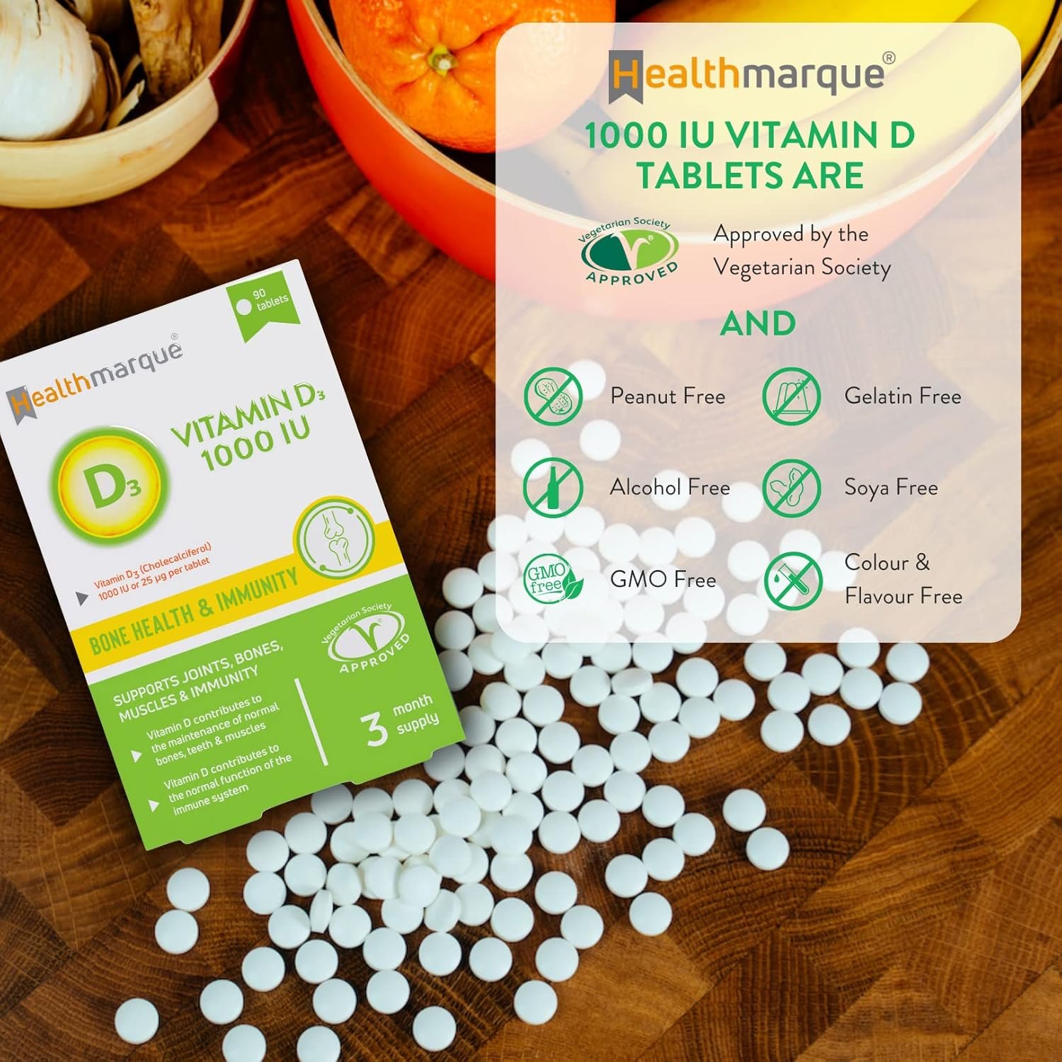 Vitamin D3 Tablets 1000iu 3 Month Supply – Premium Grade Vitamin D Supplements by Healthmarque UK; 25mcg, 90 Tablets, Bone, Muscle & Immune Support