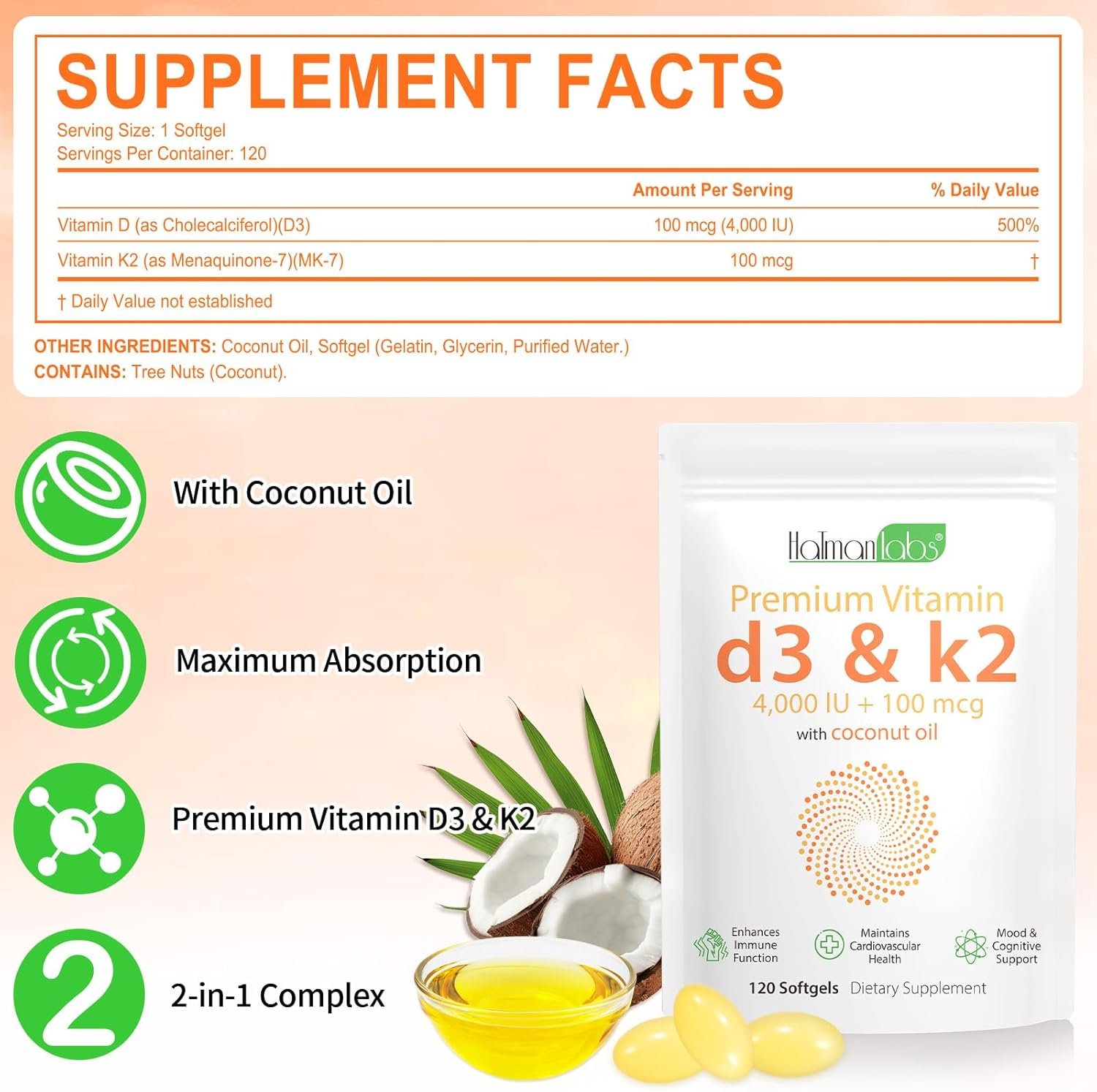 Vitamin D3&K2(MK7) Supplement Softgel, 4000 IU VIT + 100 MCG with Coconut Oil, 120 Easy-Swallow Vitamin D3 K2 Tablets, Gluten Free, High Strength Vegetarian Vitamin Supplements