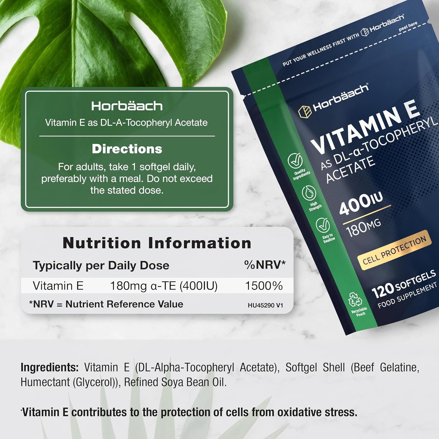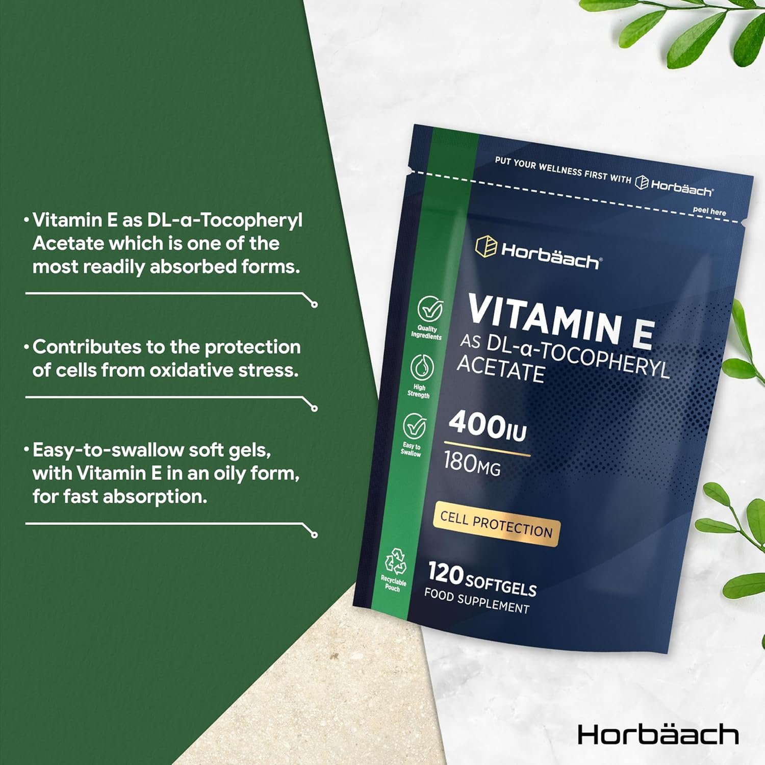 Vitamin E Capsules 400iu | 120 Softgels (4 Months Supply) | Highly Absorbable VIT E as Alpha Tocopheryl Acetate | High Strength Cell Protection from Oxidative Stress | Easy to Swallow | by Horbaach