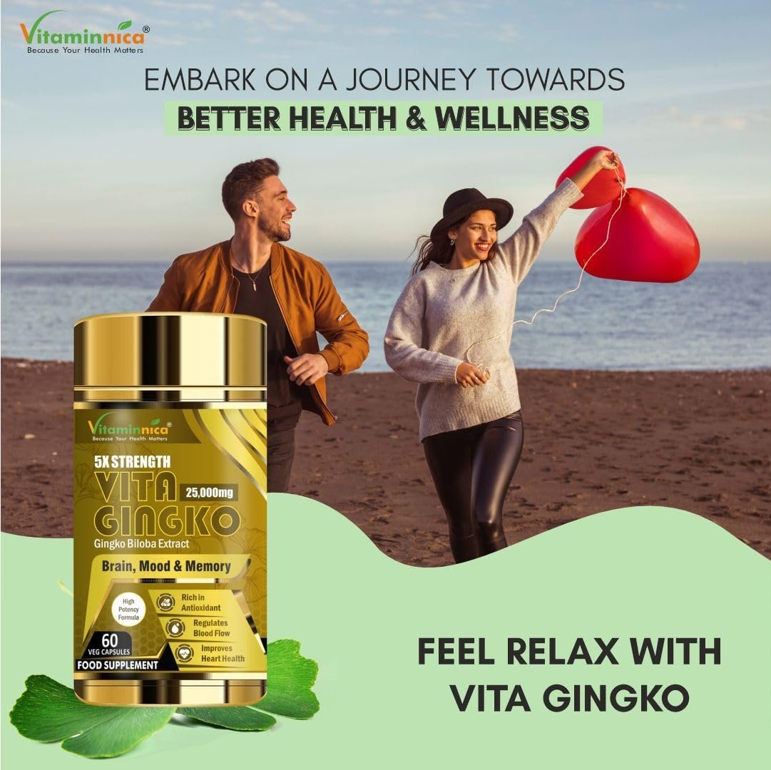 Vitaminnica Vita Gingko Biloba 5X High Strength 25000mg | Vegan Supplement | Cognitive Support, Memory, Focus & Circulation | 60 Capsules
