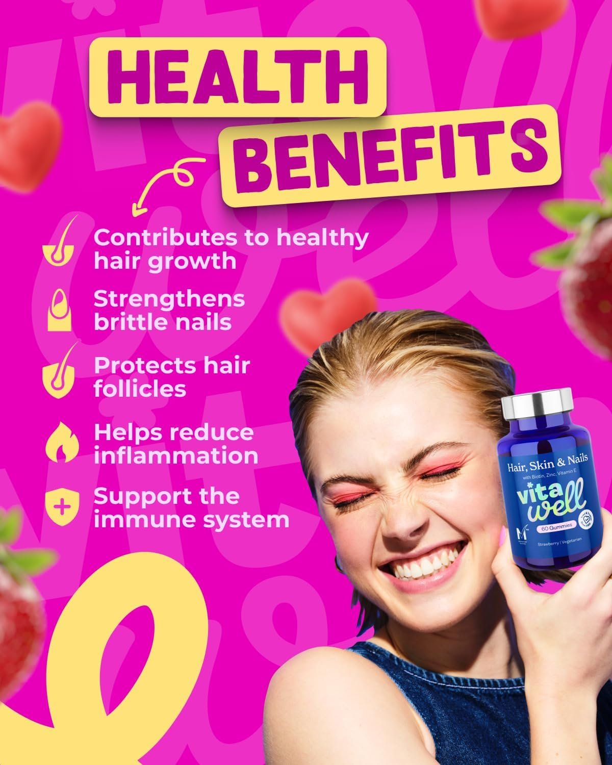 DELICIOUS STRAWBERRY FLAVOUR SUITABLE FOR VEGETARIANS: Take 2 gummies of Vitawell Hair, Skin & Nails Gummies (60 Gummies) for optimal hair, skin and nail growth, maintenance and repair. Scientifically formulated to boost repair and re-generation, in a super tasty gummy to take on the go. Suitable as a supplement for vegetarians, men and women.