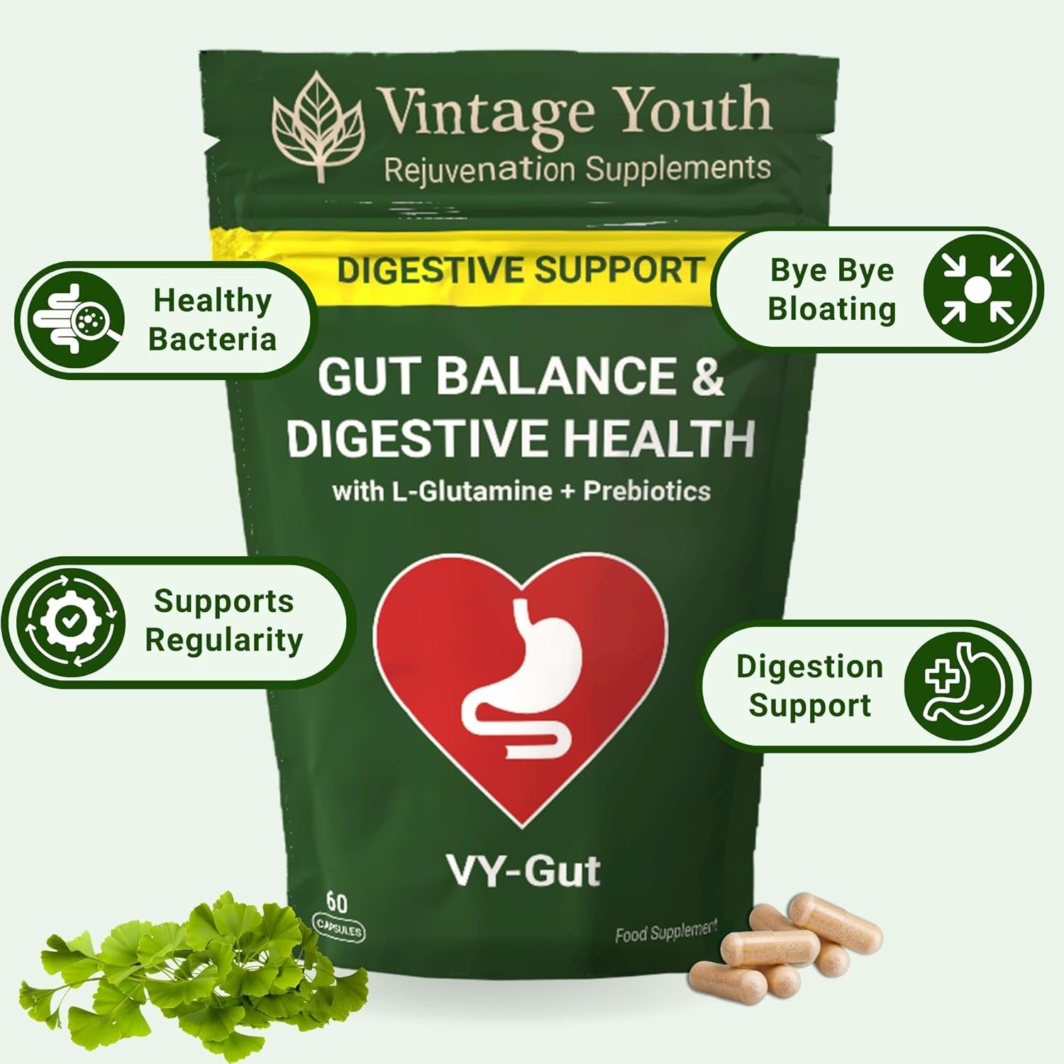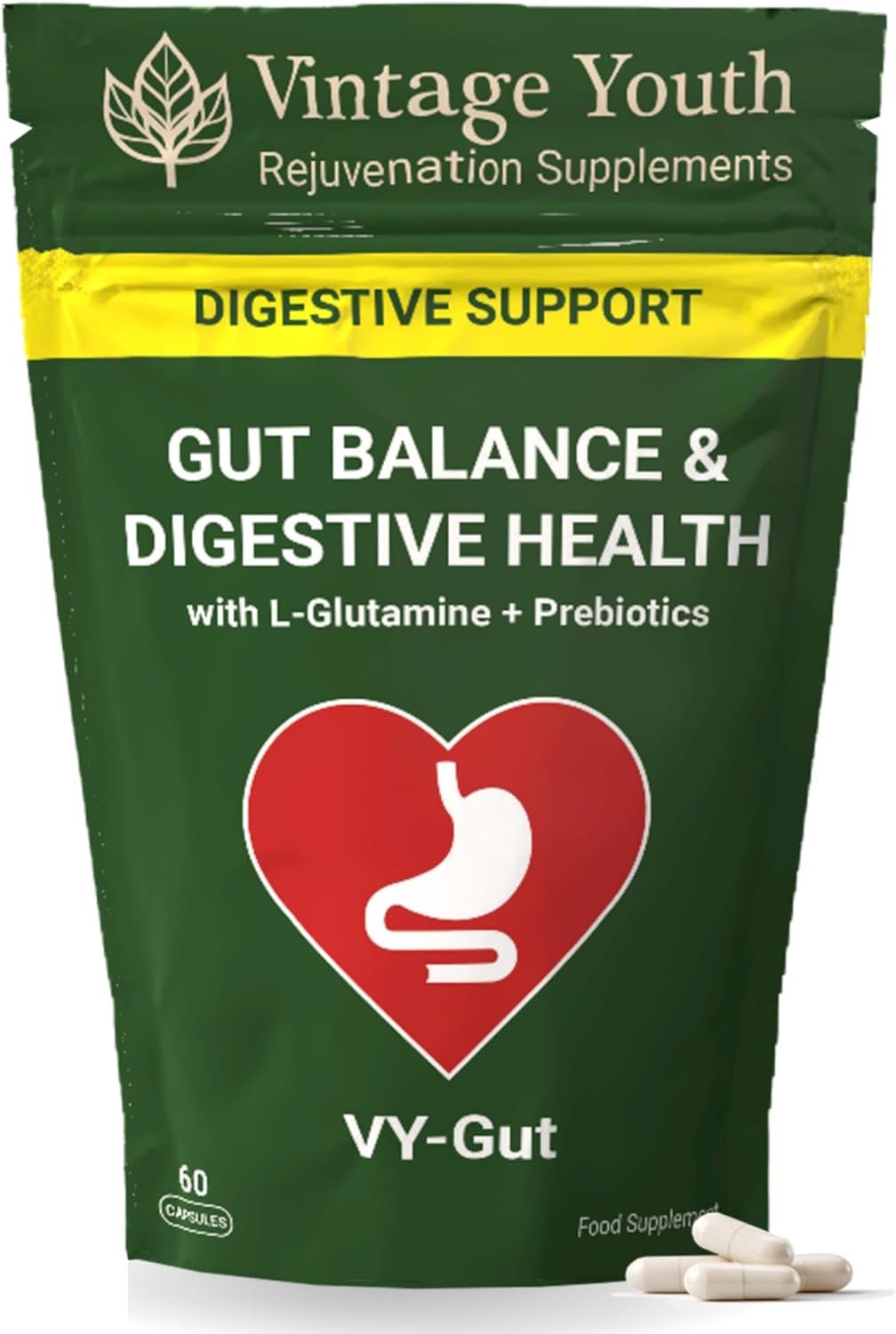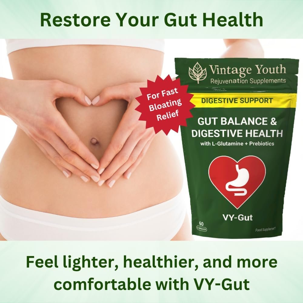 GUT HEALTH & DIGESTION SUPPORT – Naturally supports gut health and digestive comfort. VY-Gut combines prebiotics, enzymes and L-Glutamine to help maintain a balanced gut environment and promote healthy digestion every day.