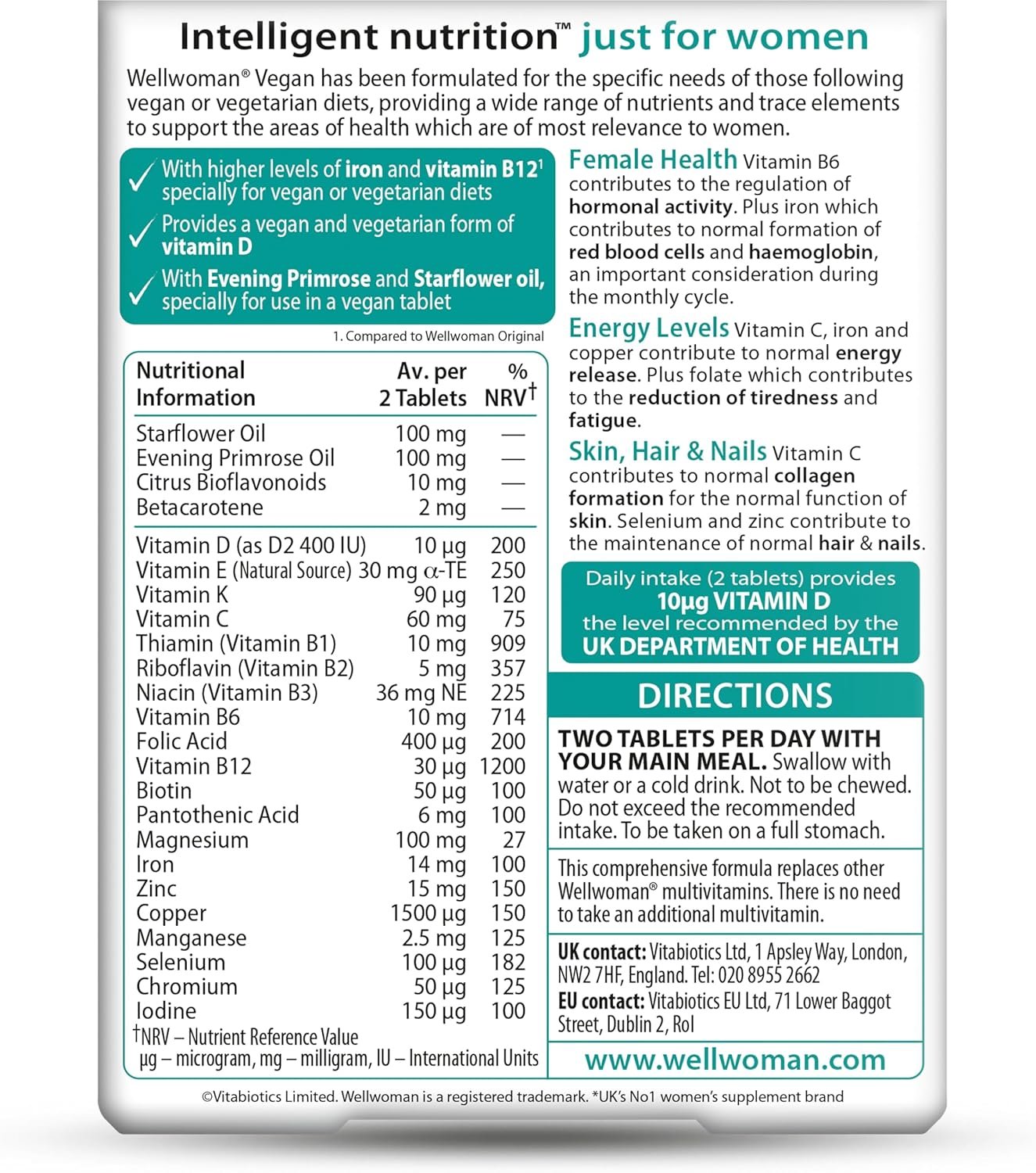 Contains higher levels of iron and vitamin B12 (comapred to Wellwoman Original) specially for vegan or vegetarian diets