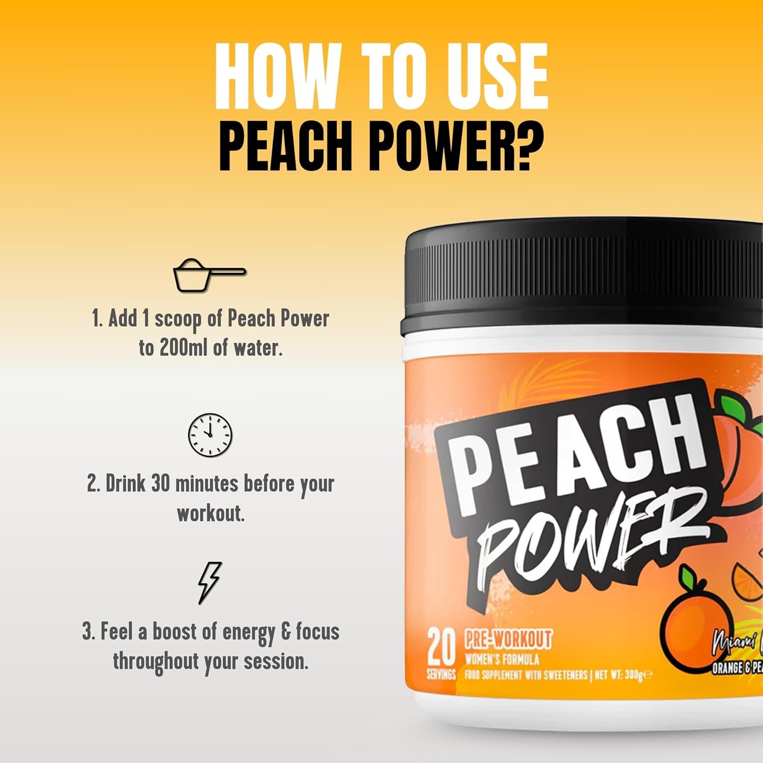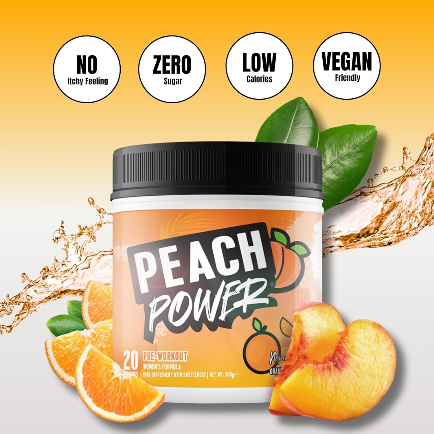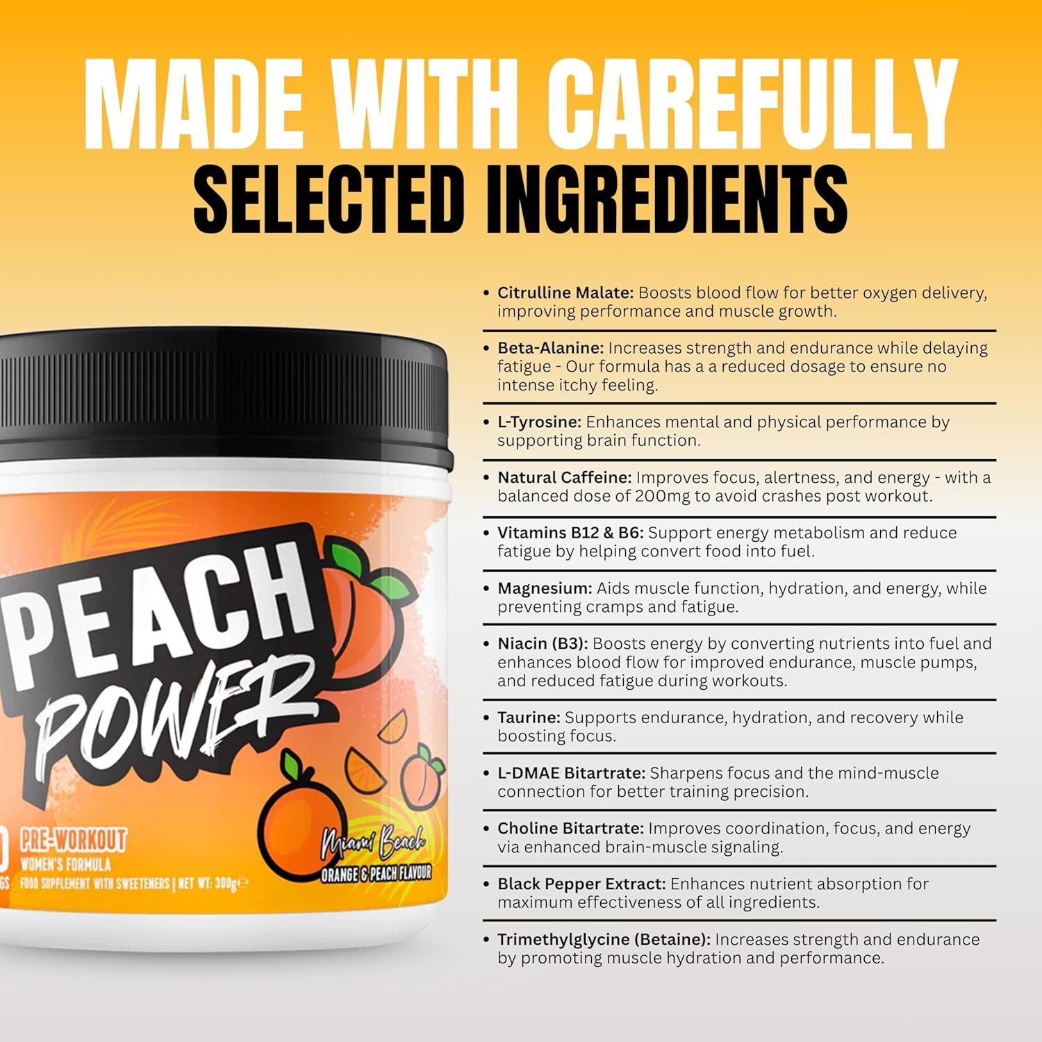 Elevate your fitness journey with Peach Power, a pre-workout formula thoughtfully crafted for women. This innovative blend delivers sustained energy and enhanced focus to maximise your workout potential. With 200mg of naturally sourced caffeine per serving, you’ll experience a refreshing boost that keeps you energised throughout your training session. What sets this formula apart is its carefully balanced composition that provides sustained stamina without the uncomfortable tingles often associated with pre-workout supplements, thanks to its modified Beta Alanine content. Each 300g container offers 20 servings of this powerful formula, enriched with essential Magnesium and vitamins B6 and B12. Whether you’re hitting the gym, joining a fitness class, or crushing a home workout, this pre-workout supplement helps you maintain peak performance and mental clarity. The formula is designed to provide steady energy without the dreaded post-workout crash, helping you stay focused and energised throughout your fitness routine.