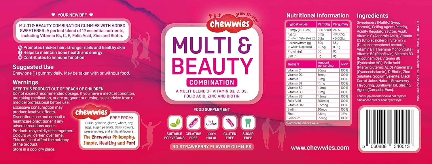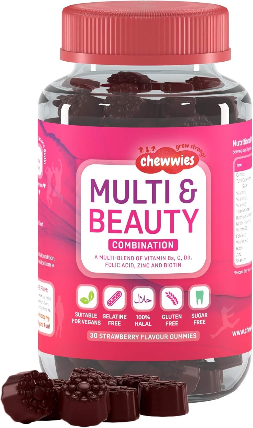 Berry flavoured multivitamin gummies, containing a specially chosen selection of essential vitamins. Delicious sugar-free Vitamin D3 gummies that are packed with citrus extracts to support healthy growth and development. Chewwies Iron and Vitamin C combination will help support red blood cell production, immune system function, reduce tiredness and fatigue and aid oxygen transport throughout your body. Single one a day gummy from vegans to busy moms. Suitable for all Contains a perfect blend of your daily multivitamins with an additional blend of nutrients and antioxidants to support a healthy and beautiful body. Suitable for teenagers and adults.