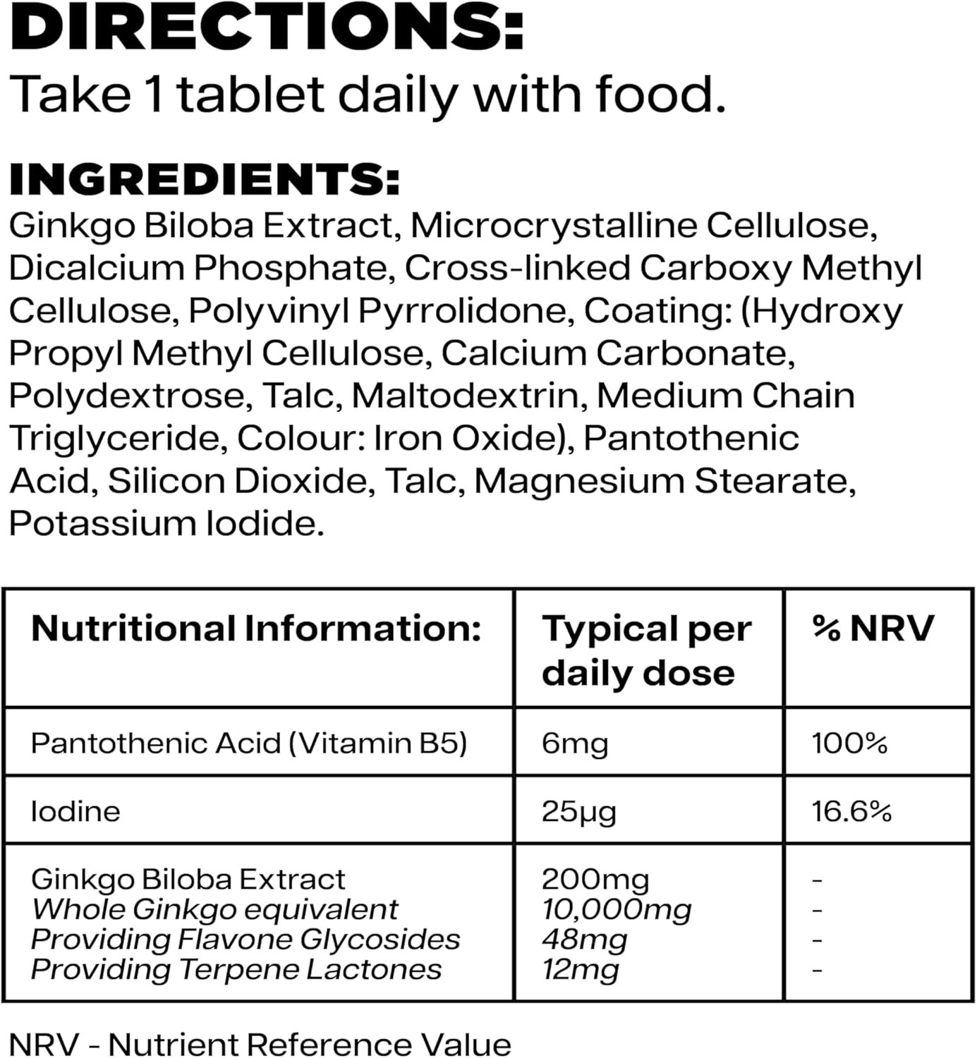 Ginkgo Biloba Extract, Microcrystalline Cellulose, Dicalcium Phosphate, Cross-linked Carboxy Methyl Cellulose, Polyvinyl Pyrrolidone, Coating: (Hydroxy Propyl Methyl Cellulose, Calcium Carbonate, Polydextrose, Talc, Maltodextrin, Medium Chain Triglyceride, Colour: Iron Oxide), Pantothenic Acid, Silicon Dioxide, Talc, Magnesium Stearate, Potassium Iodide.