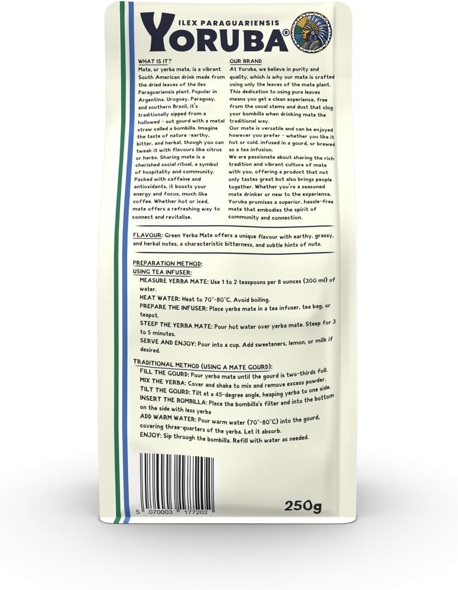 YORUBA Green Mate is known for its bright, fresh taste and invigorating energy boost. Made from carefully air-dried yerba mate leaves, this variety has a crisp, grassy flavour with subtle hints of natural sweetness. The clean, vibrant taste of Green Mate makes it a refreshing choice for any time of day. It delivers a smooth, sustained energy lift that enhances mental clarity and physical endurance without the jittery effects of coffee. Perfect for starting your day or recharging in the afternoon, YORUBA Green Mate keeps you energized and focused naturally.