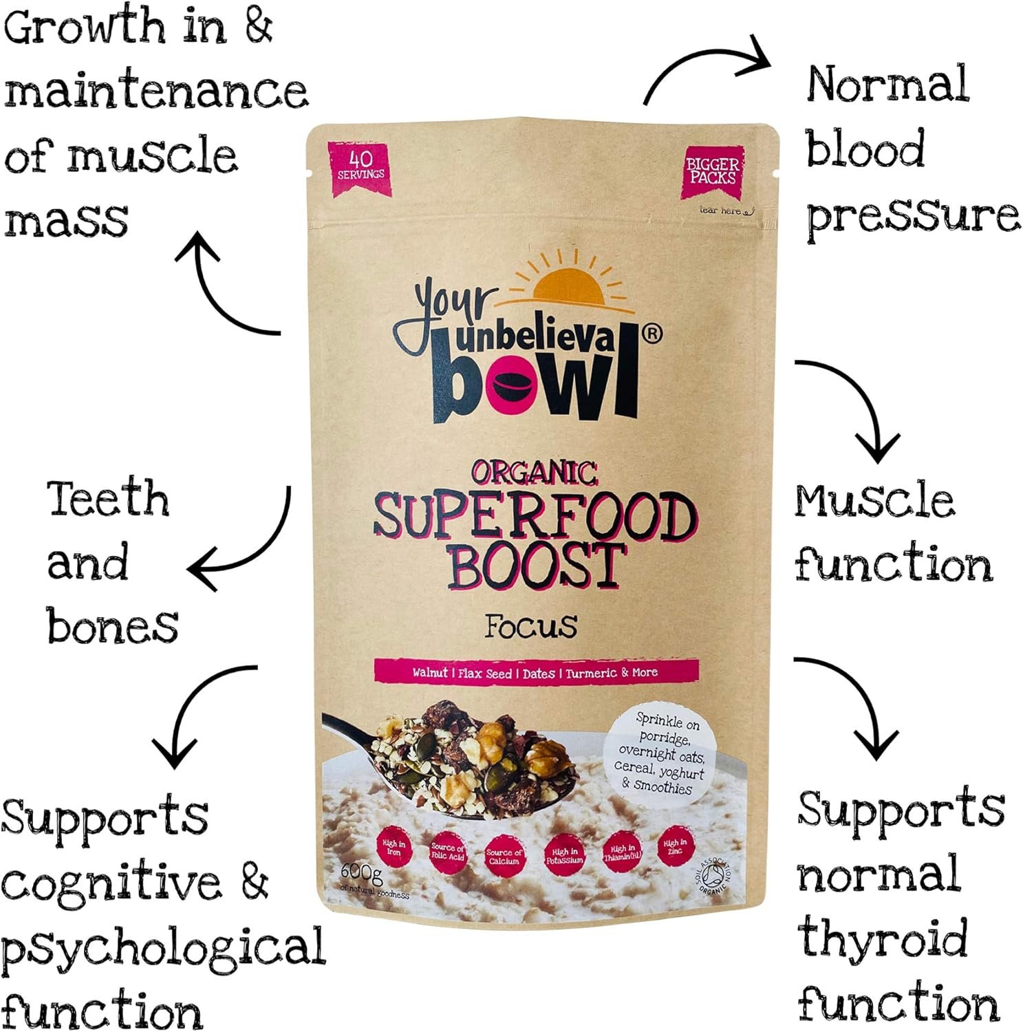 Your UnbelievaBowl – Organic Superfood Boost (FOCUS) 600g, 40 Servings, 45p Per Serving, Gluten Free, Chia Seeds, Hemp Seeds, Dates, Walnuts, Pumpkin Seeds, Cacao, Flaxseed, Turmeric