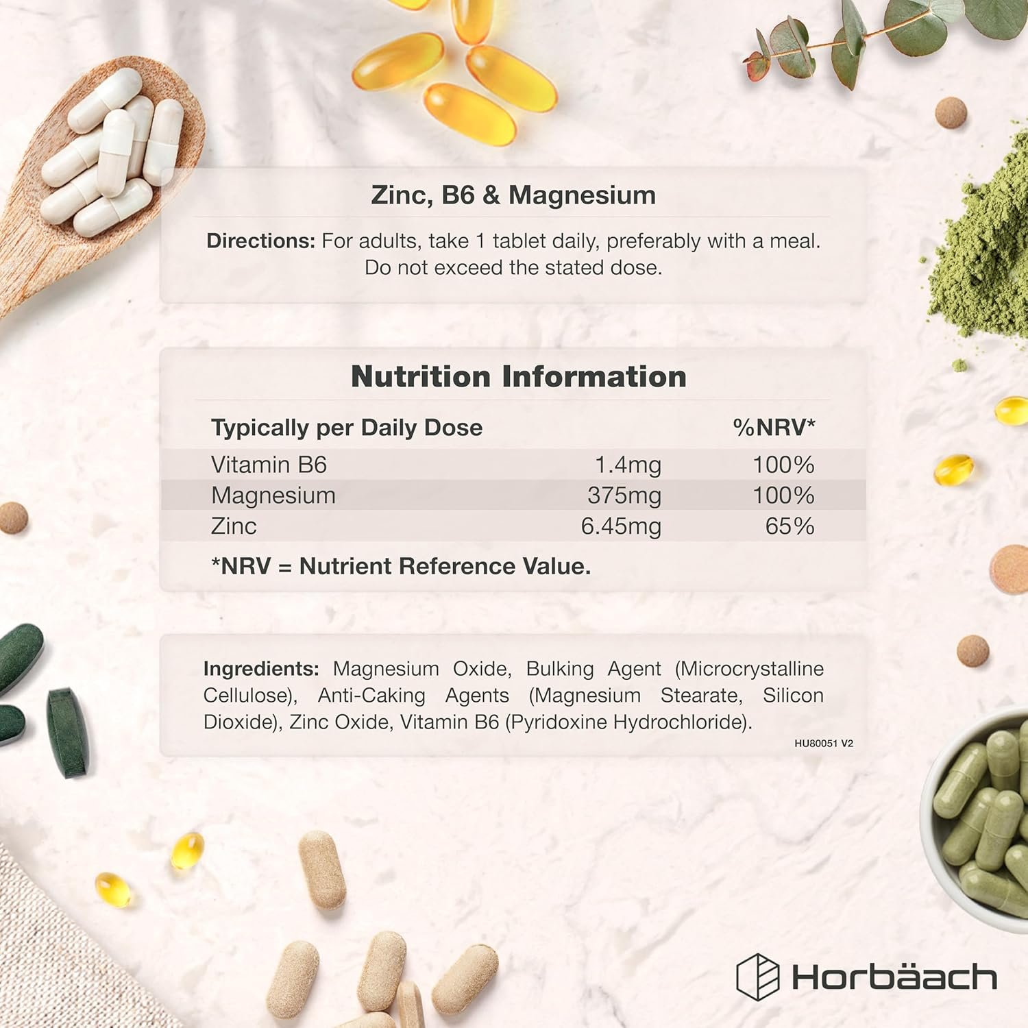 SUITABLE FOR: Horbaach Zinc, B6 & Magnesium tablets are 100% vegan, offering a balanced formula ideal for adult men and women – at an exceptional value. Please be aware that our tablets may contain naturally occurring black marks. These marks are a result of the natural ingredients used. They do not affect the quality, safety, or efficacy of the product.