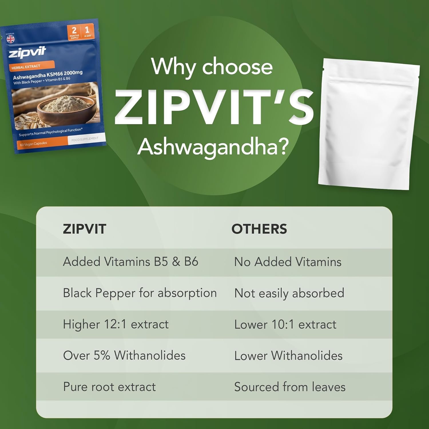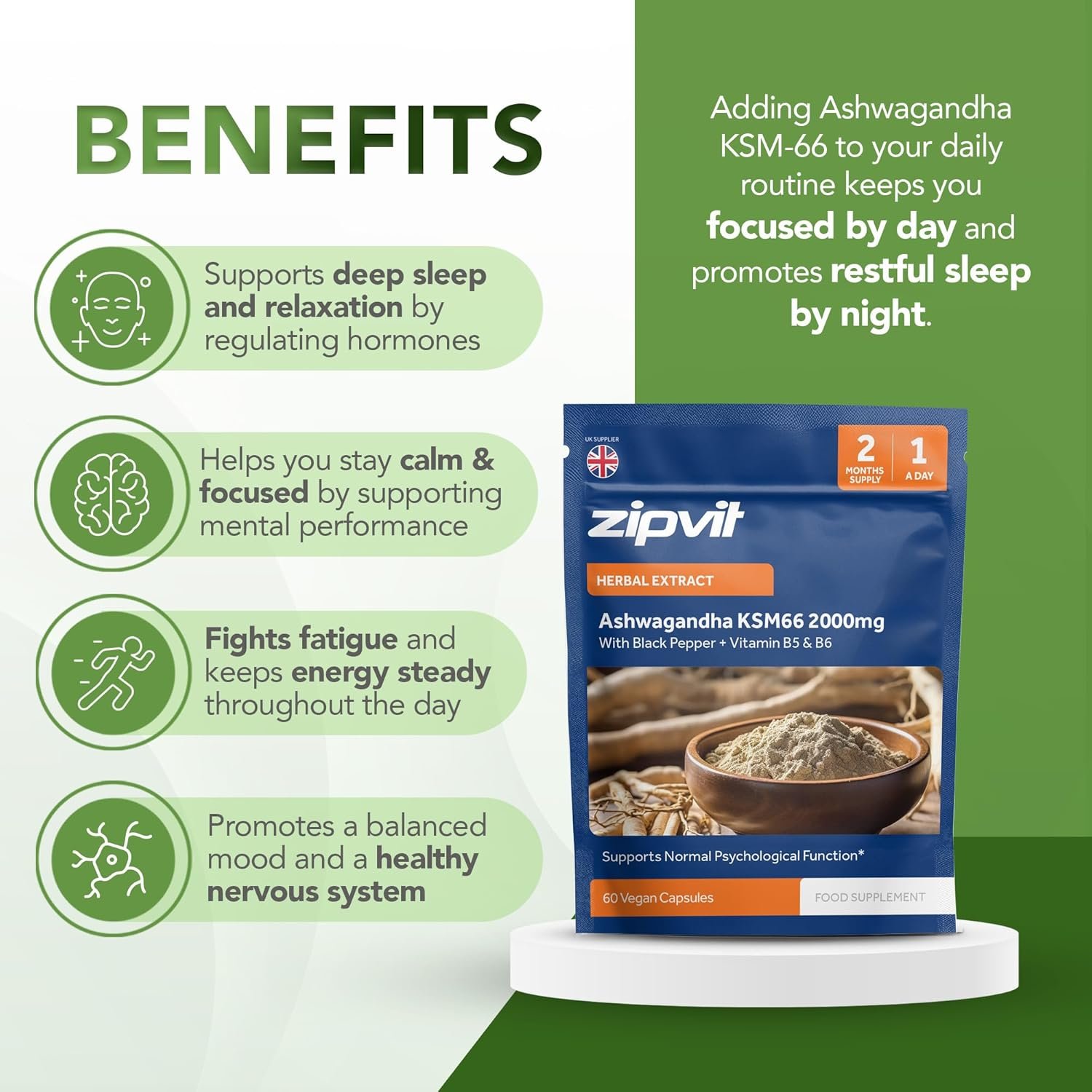 Zipvit Ashwagandha KSM 66 2000 mg with Vitamin B6, B5 & Black Pepper, High Strength Ashwagandha Root Extract, 60 Vegan Capsules, 2 Months Supply