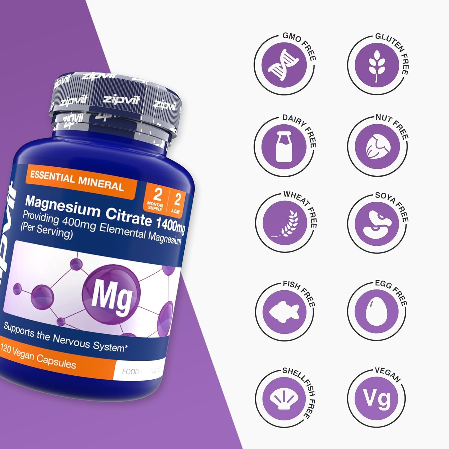 Zipvit Magnesium Citrate 1400mg, Provides 400mg Elemental Magnesium, Highly Absorbable for Bone, Muscle & Energy Support. 120 Vegan Capsules, 2 a Day, 2 Months Supply.