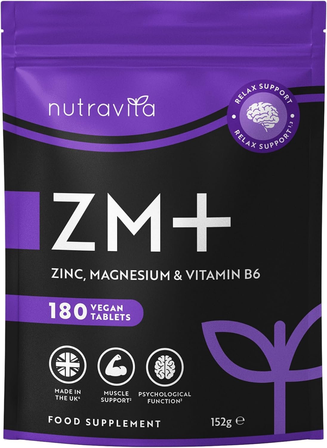 ZM+ Supplements for Men & Women – 180 High Strength Tablets (6 Months) – Vegan Supplement Zinc Magnesium Vitamin B6 – Sleep Aid, Muscle Recovery, Supports Testosterone Levels – UK Made – Nutravita